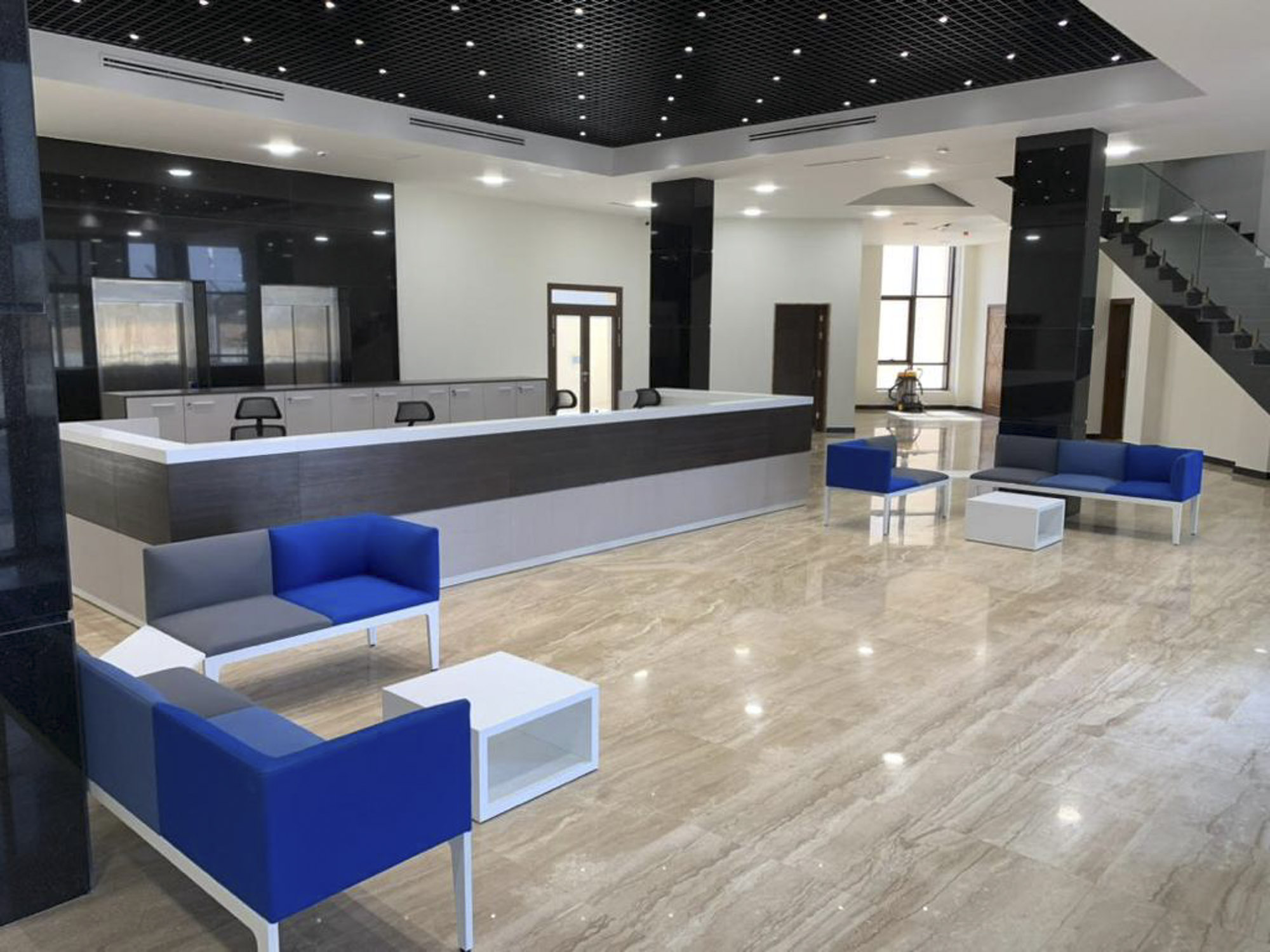 Gli spazi interni si articolano su più livelli funzionali. La hall d’ingresso si configura come uno spazio scenografico caratterizzato da pavimentazioni in marmo chiaro lucido, reception moderna con pannelli neri lucidi e volumi geometrici bianchi e blu che creano sedute informali, mentre ampie vetrate perimetrali garantiscono luminosità naturale abbondante. Il controsoffitto nero a cassettoni crea profondità visiva e integra l’illuminazione diffusa attraverso corpi illuminanti incassati disposti secondo geometrie regolari.