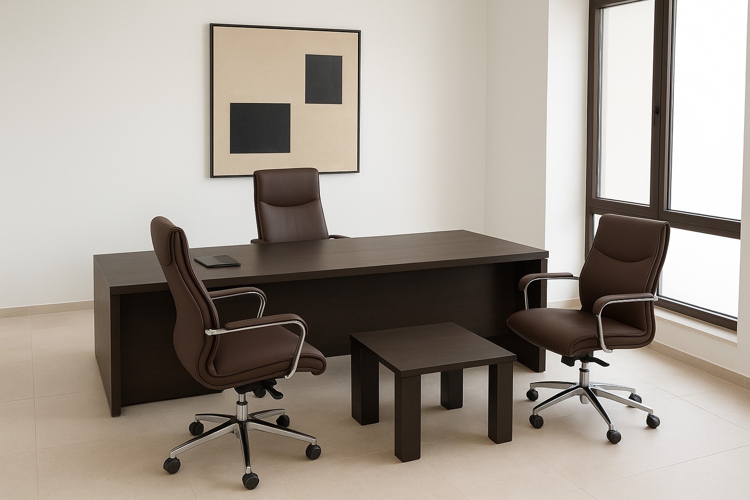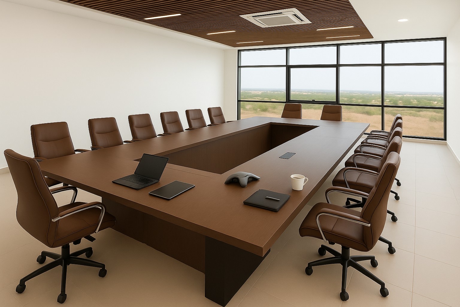 Gli ambienti di rappresentanza includono una sala ricevimenti circolare con tavolo rotondo centrale rivestito in marmo chiaro circondato da eleganti sedute imbottite color champagne con schienali capitonné, creando uno spazio formale per incontri istituzionali illuminato da lucernari zenitali e valorizzato da ampie vetrate che offrono viste sul paesaggio circostante. Gli uffici direzionali si configurano con scrivanie esecutive in legno scuro, sedute in pelle e arredi coordinati che comunicano autorevolezza e professionalità.