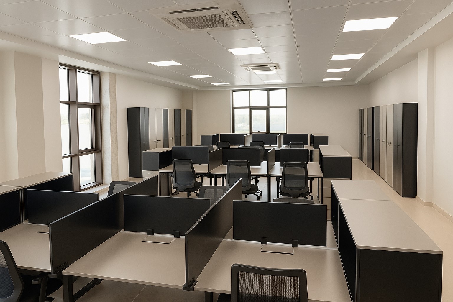 Le aree operative si sviluppano in open space luminosi con postazioni di lavoro moderne disposte in isole, caratterizzate da scrivanie bianche con strutture nere, sedute ergonomiche e divisori bassi che garantiscono privacy visiva mantenendo apertura comunicativa. Le ampie finestre con infissi neri offrono viste esterne e inondano gli ambienti di luce naturale, mentre pavimentazioni chiare riflettono la luminosità creando spazi ariosi e professionali. Pilastri strutturali rivestiti in finiture scure scandiscono ritmicamente gli spazi e supportano i controsoffitti tecnici che integrano impianti di climatizzazione e illuminazione.