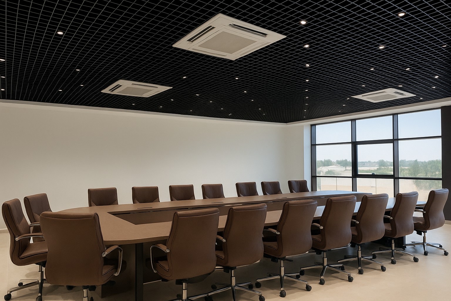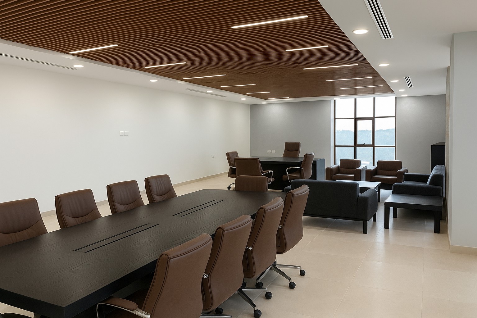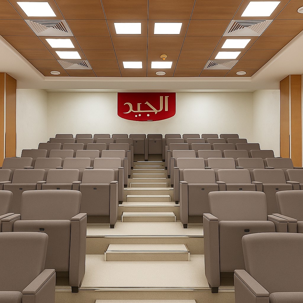 Le sale riunioni presentano configurazioni diverse secondo le esigenze funzionali.  Una sala conferenze distintiva si caratterizza per la disposizione a gradoni delle sedute beige rivestite in tessuto, che creano un’aula assembleare rivolta verso un palco frontale dove il logo ALJAED rosso su fondo grigio marca l’identità aziendale, mentre il controsoffitto in legno a doghe introduce calore materico allo spazio altrimenti caratterizzato da finiture contemporanee.