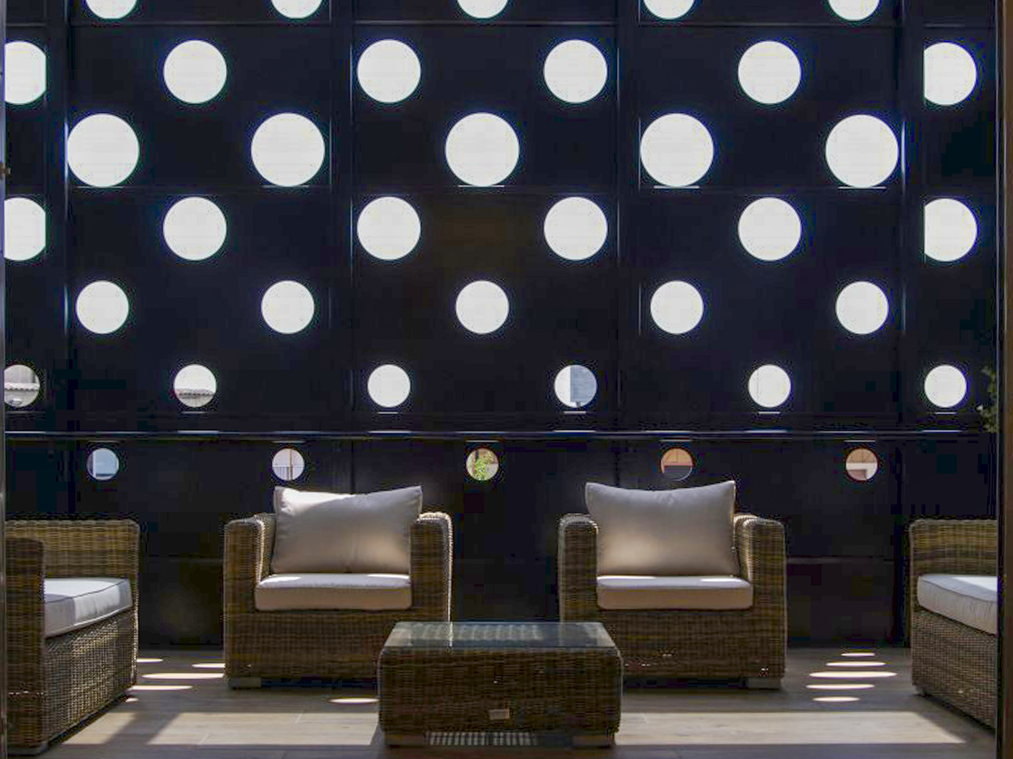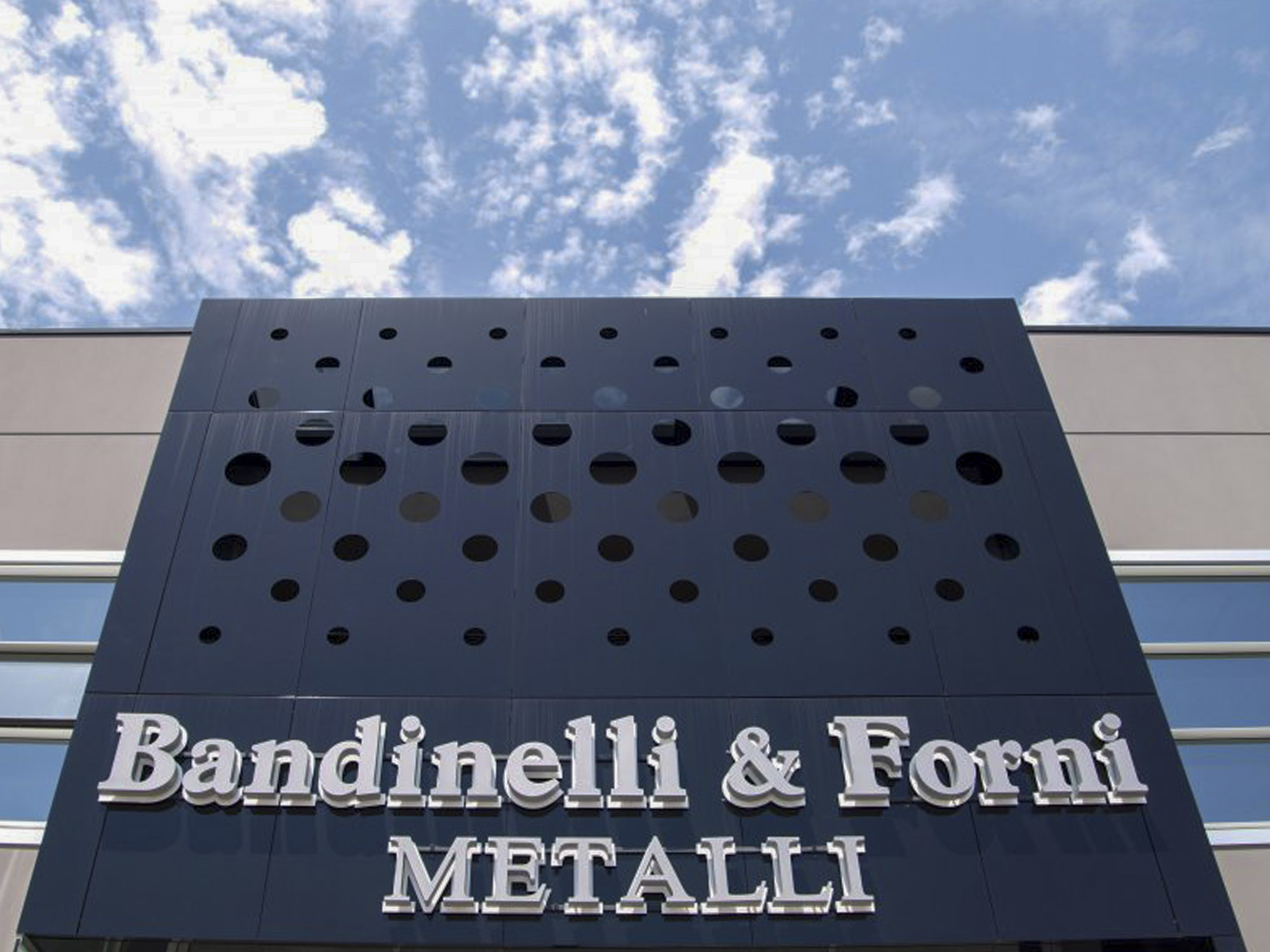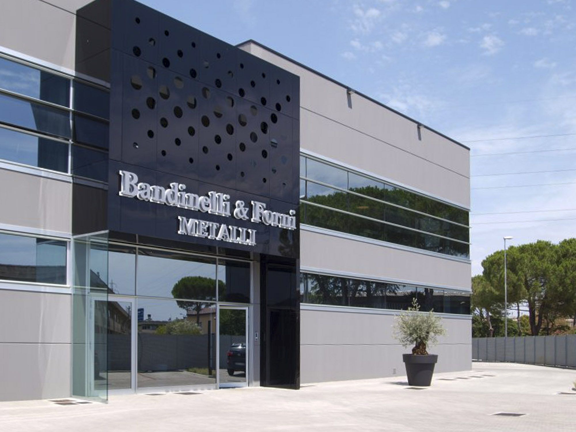 Il progetto per la sede Bandinelli & Forni Metalli rappresenta un intervento architettonico completo che trasforma gli spazi aziendali in un ambiente rappresentativo dove design contemporaneo e identità corporate si fondono armoniosamente. L’edificio si presenta all’esterno con una facciata distintiva caratterizzata da un rivestimento nero traforato a pattern circolare che crea un gioco grafico di pieni e vuoti, alternato a superfici vetrate e pannelli grigio chiaro che definiscono i volumi con eleganza industriale. L’insegna aziendale si integra perfettamente nella composizione architettonica, mentre l’ingresso vetrato introduce alla qualità degli spazi interni.