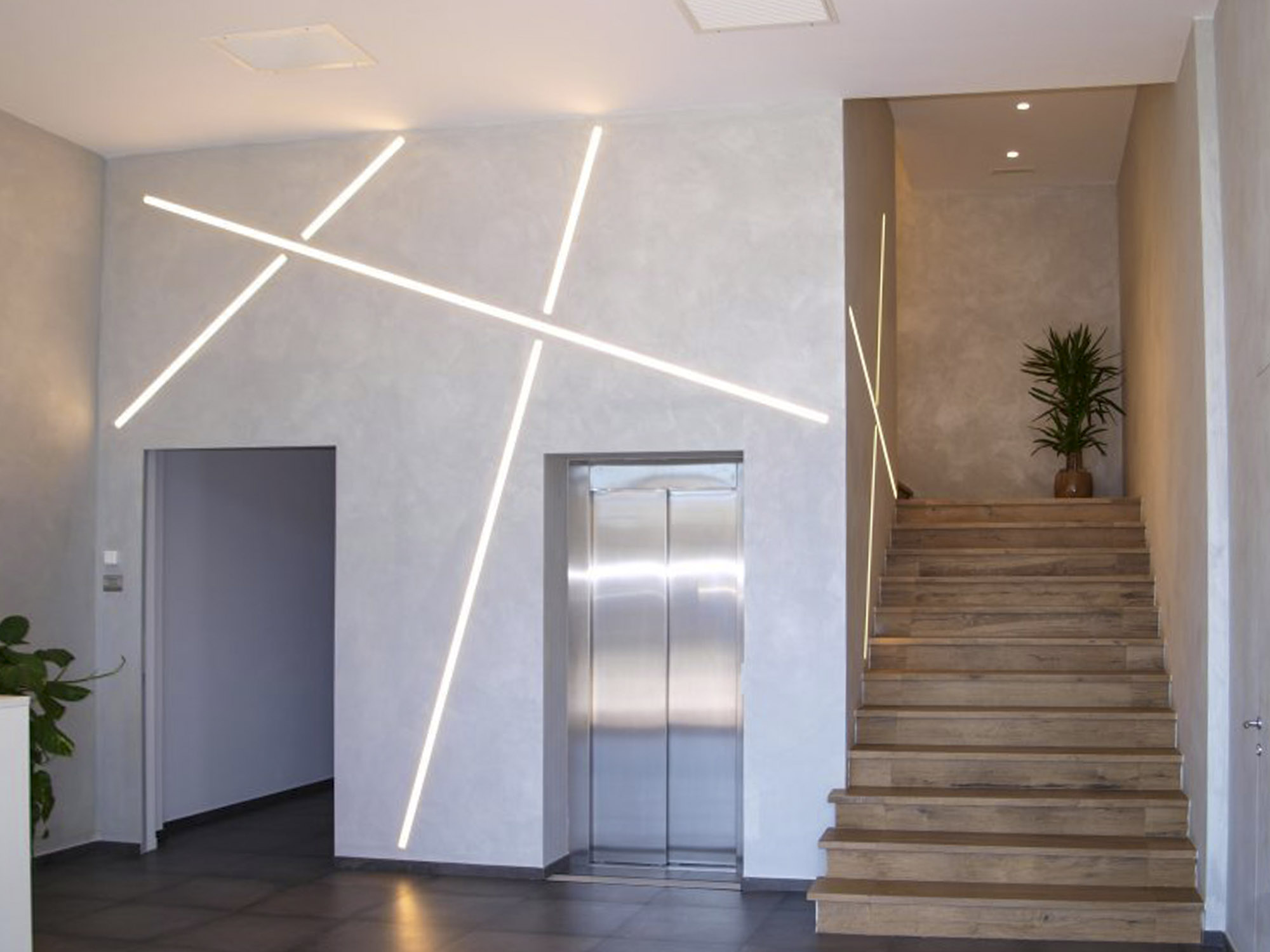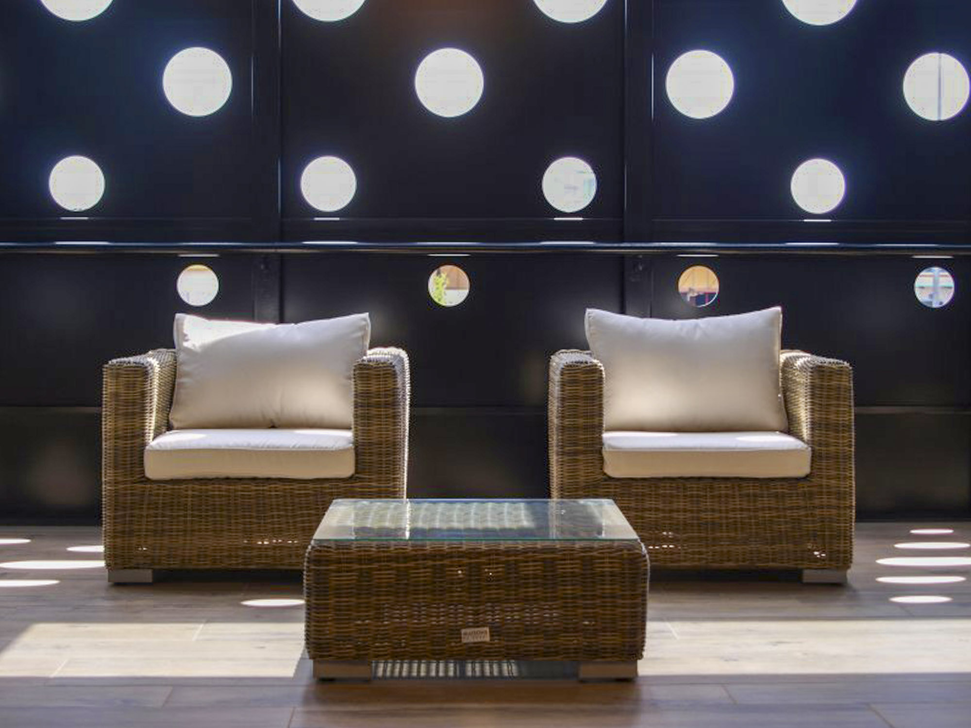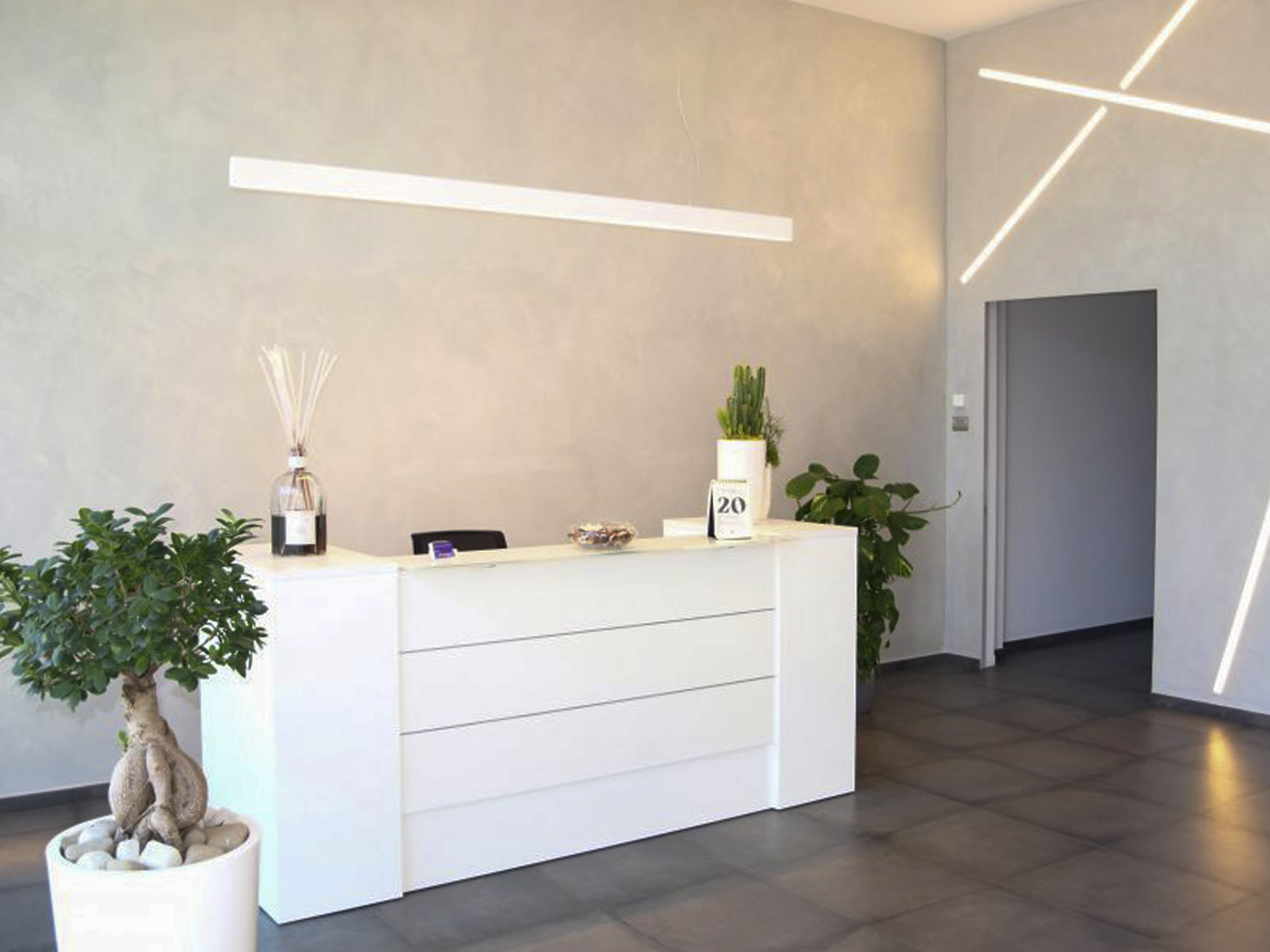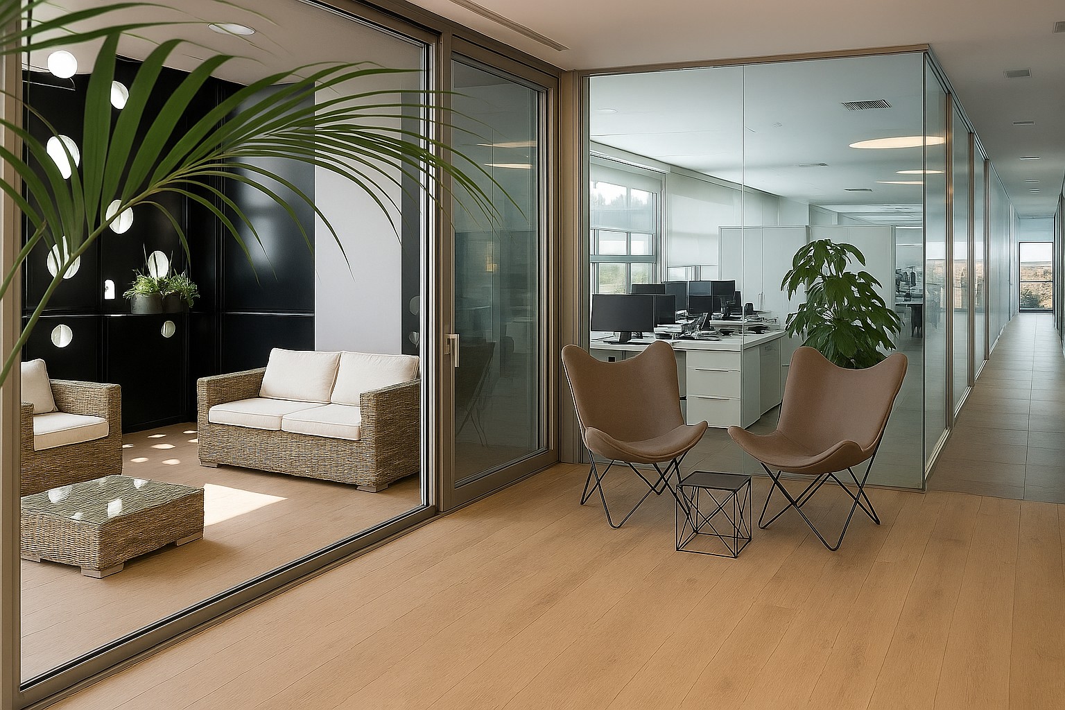 Gli ambienti interni si sviluppano secondo un linguaggio estetico raffinato dove il parquet in legno naturale crea continuità tra le diverse aree, portando calore e naturalezza agli spazi di lavoro. La reception si configura come un elemento scultoreo bianco minimale, illuminato da sistemi LED integrati che disegnano linee luminose sulle pareti, creando un’accoglienza dal forte impatto visivo. L’area lounge rappresenta un momento di particolare ricercatezza progettuale: una parete nera lucida decorata con cerchi luminosi bianchi a rilievo crea una quinta scenografica che dialoga con divani in pelle dai toni naturali e tavolini bassi in materiali pregiati, componendo uno spazio di attesa che comunica solidità e contemporaneità.