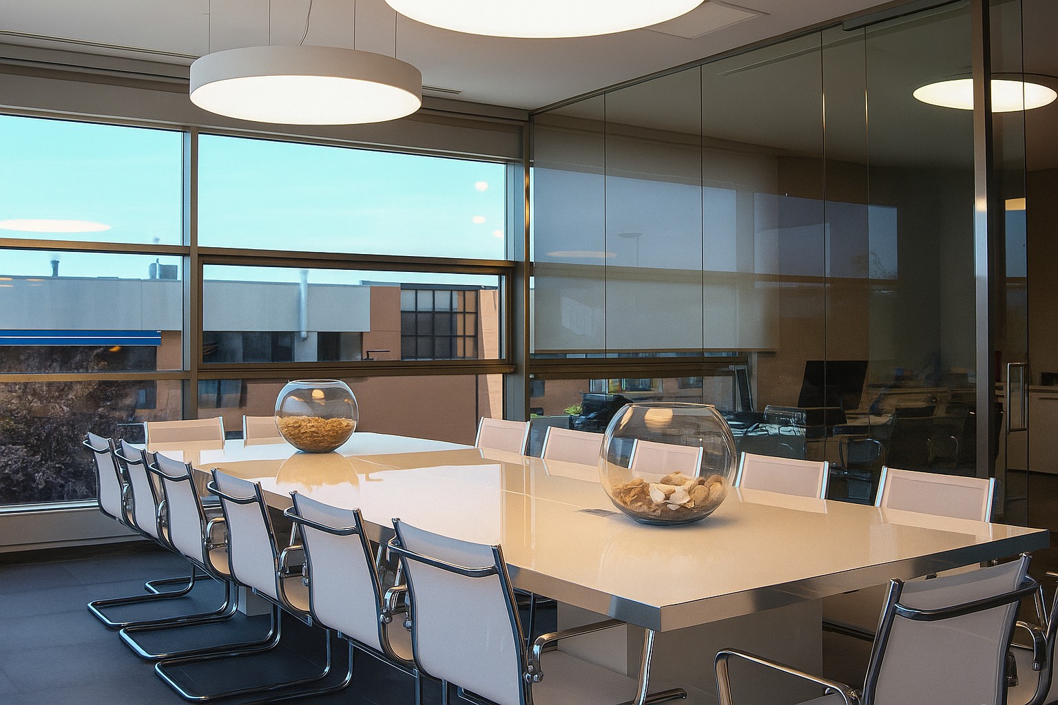 Le partizioni vetrate permettono la trasparenza visiva tra le diverse aree operative, mantenendo separazione acustica e funzionale. Gli uffici si aprono su corridoi luminosi caratterizzati da finiture bianche e pavimenti in legno, mentre elementi architettonici come scale in legno a sbalzo e installazioni luminose geometriche a parete creano dinamismo verticale e orizzontale. Le sale riunioni beneficiano di ampie vetrate con tonalità azzurre che filtrano la luce naturale, arredate con tavoli in legno chiaro e sedie contemporanee che creano ambienti professionali ed accoglienti.