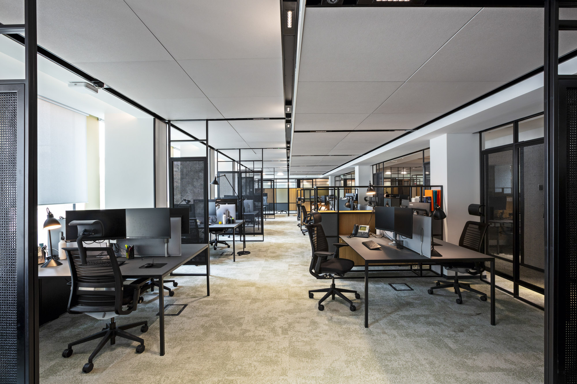 Gli spazi operativi si configurano come ambienti modulari caratterizzati da scrivanie nere essenziali affiancate a credenze basse coordinate, sedute ergonomiche operative in rete nera con strutture cromate che garantiscono comfort prolungato, e lampade da tavolo articolate nere che forniscono illuminazione d’accento personalizzabile. Le pavimentazioni in moquette tessile chiara con texture delicate ammorbidiscono l’acustica e creano comfort tattile, mentre i controsoffitti tecnici bianchi a pannelli modulari integrano illuminazione LED diffusa, sistemi di climatizzazione e impiantistica tecnologica.