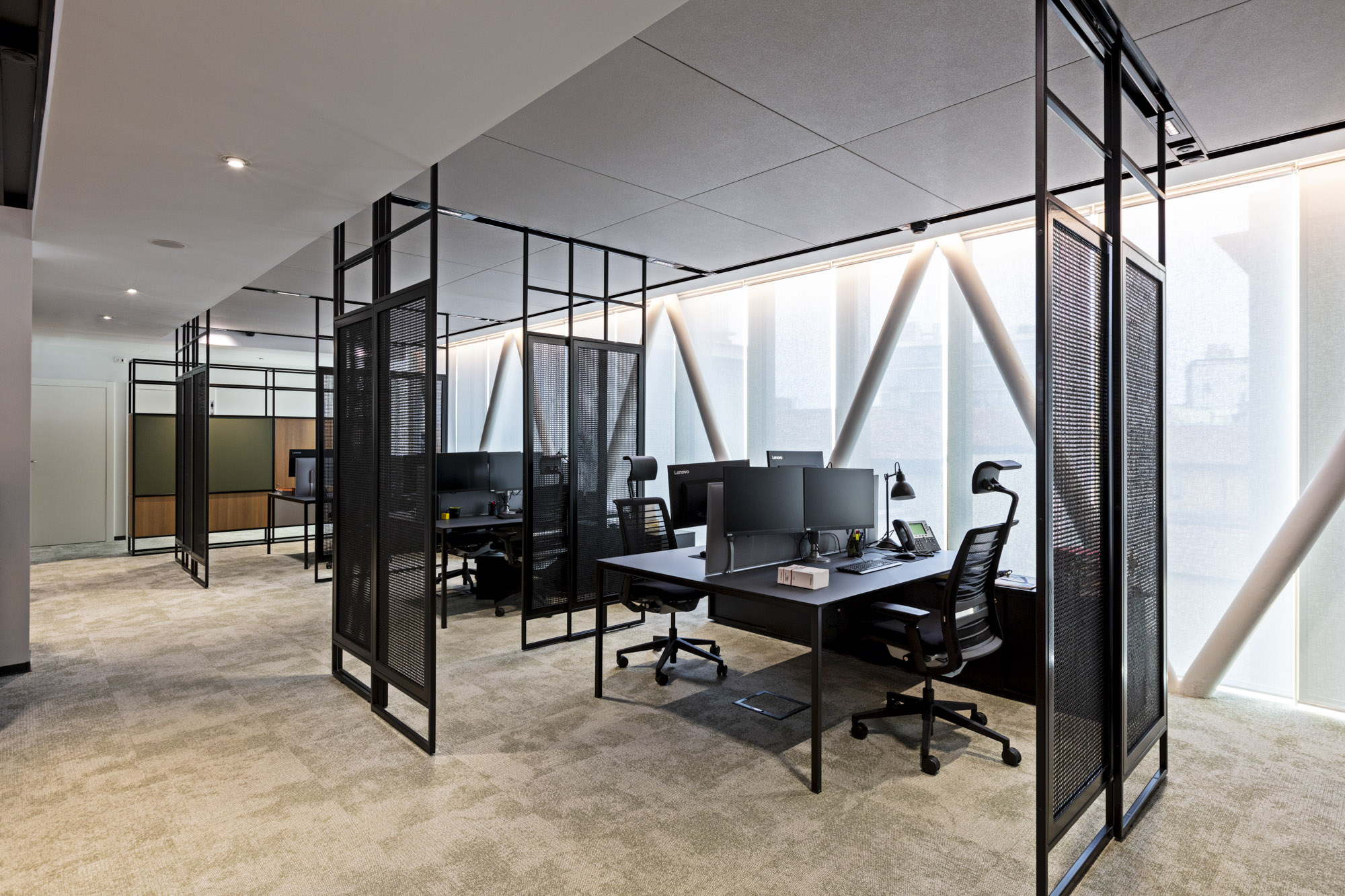 Le partizioni vetrate con telai neri in stile industriale contemporaneo rappresentano l’elemento distintivo del progetto, creando una griglia visiva ordinata che scandisce gli spazi mantenendo permeabilità ottica e luminosità diffusa. Queste strutture a tutta altezza con profili metallici sottili definiscono uffici individuali e sale meeting garantendo privacy acustica pur preservando apertura visiva, mentre alcune superfici vetrate presentano pellicole microperforante nere che filtrano la vista creando trasparenze graduate e introducendo texture decorativa.