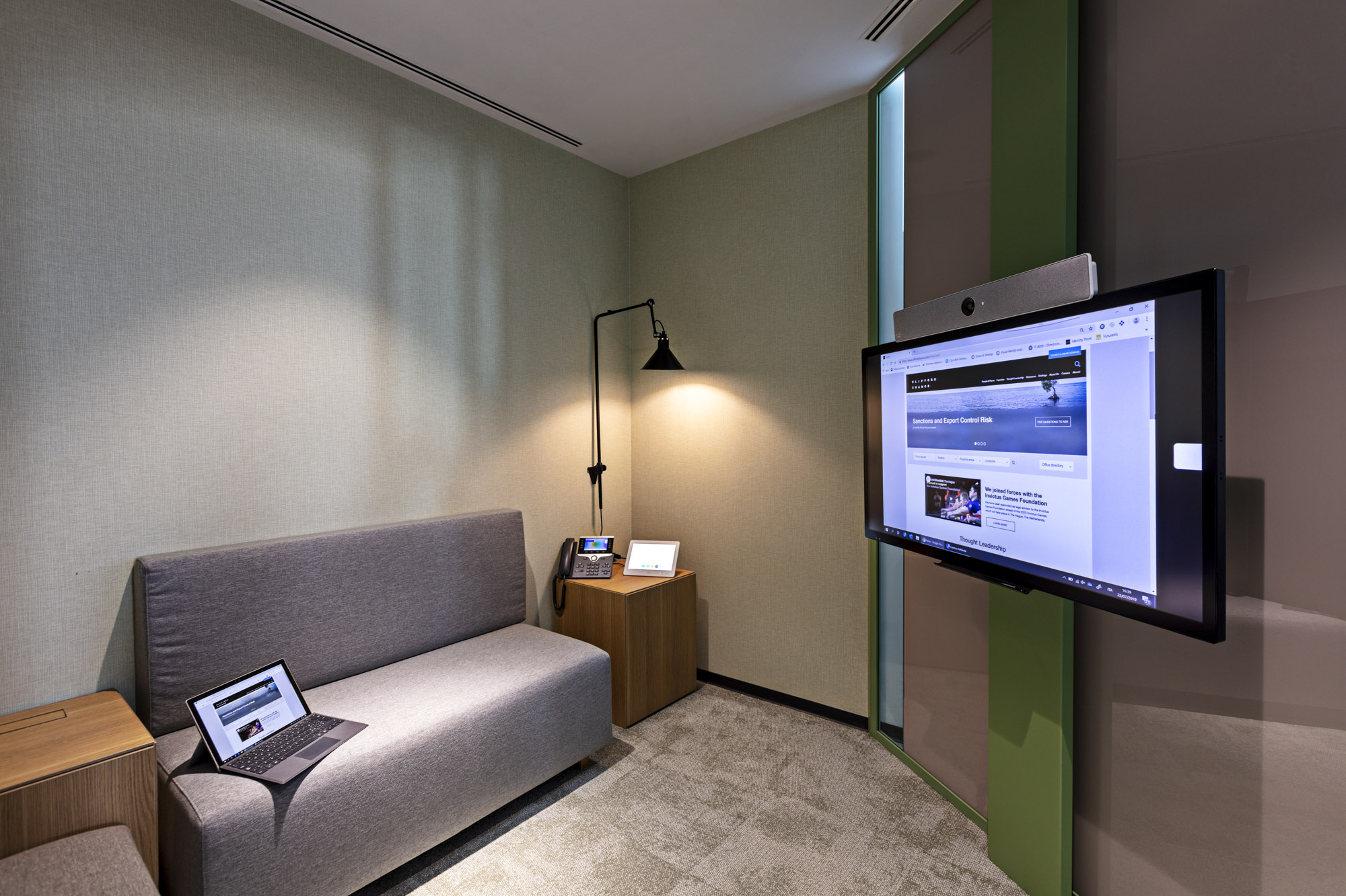 Le phone booth e gli spazi individuali di concentrazione si configurano come micro-ambienti raccolti caratterizzati da pareti imbottite grigie che garantiscono isolamento acustico, sedute confortevoli con tessuti texturizzati, mensole in legno integrate che offrono superfici d’appoggio, lampade da parete orientabili nere per illuminazione diretta, e schermi tecnologici a parete per lavoro digitale. Alcune pareti presentano finiture in verde bosco che introducono accenti cromatici sobri e rilassanti, mentre dettagli in ottone spazzolato aggiungono note di raffinatezza.