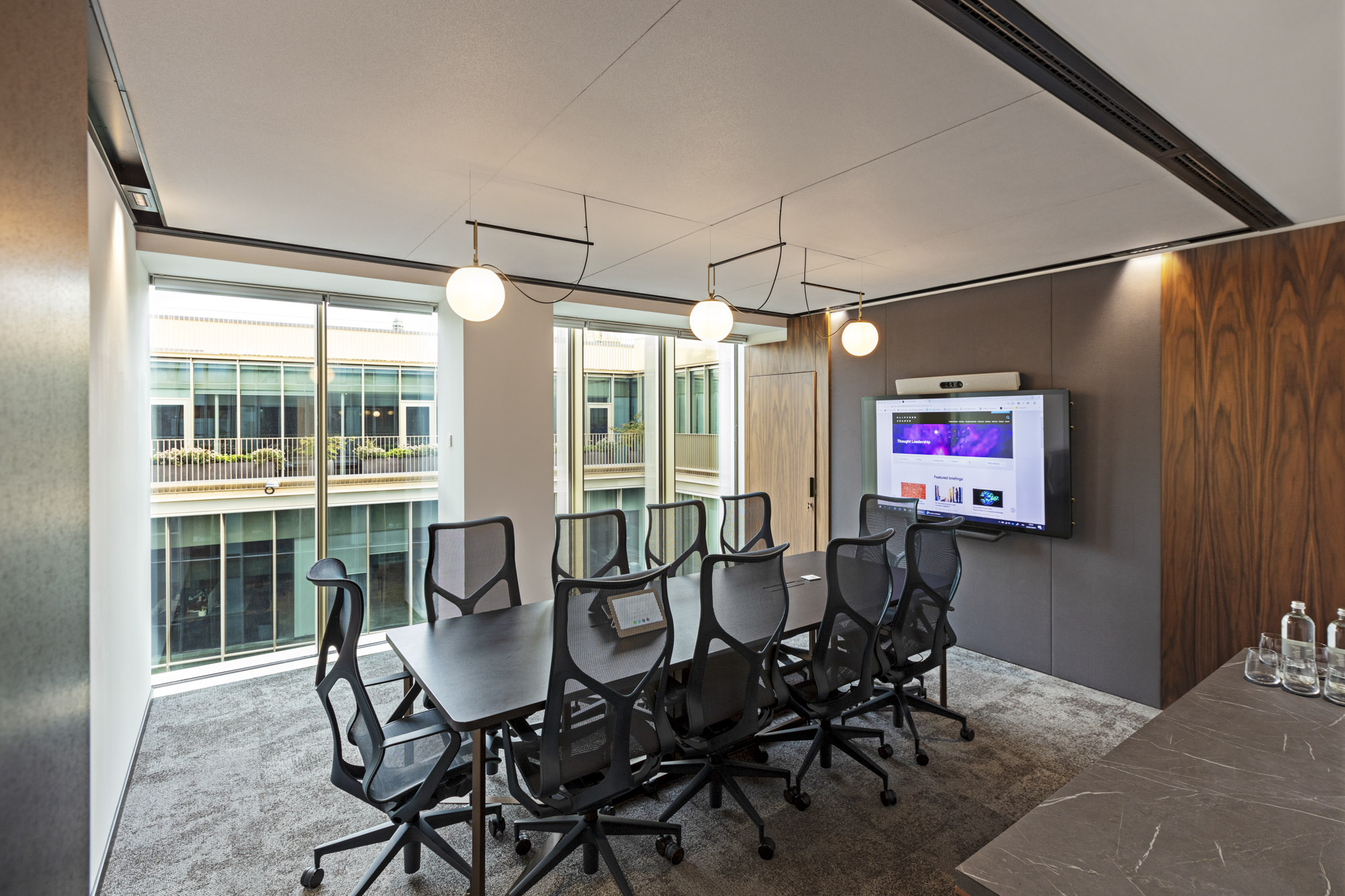 L’illuminazione è orchestrata su più livelli creando atmosfere professionali ma accoglienti: luce naturale abbondante dalle ampie vetrate perimetrali che si affacciano su terrazze verdi, illuminazione diffusa dai pannelli LED incassati nei controsoffitti che garantisce uniformità luminosa, lampade sferiche sospese bianche che creano punti focali decorativi nelle sale riunioni, e sistemi di binari elettrificati neri che supportano faretti orientabili per illuminazione d’accento. L’integrazione impiantistica è discreta con griglie di diffusione e bocchette di climatizzazione coordinate cromaticamente.