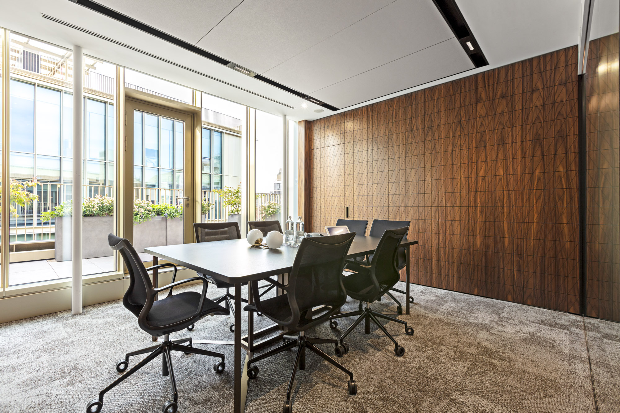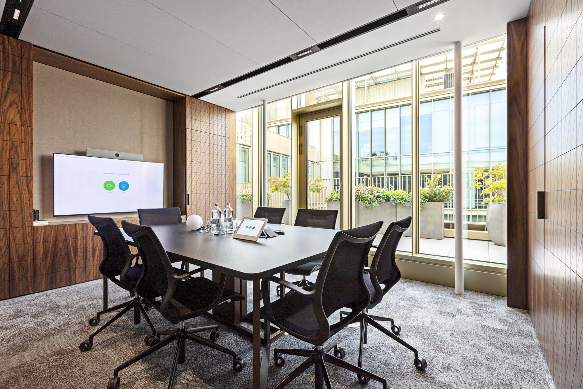 Le sale riunioni presentano configurazioni diverse calibrate sulle esigenze funzionali: dalle sale consiliari con lunghi tavoli bianchi rettangolari circondati da sedute ergonomiche nere che possono ospitare numerosi partecipanti, alle sale meeting più contenute per riunioni riservate. Tutte beneficiano di ampie vetrate perimetrali che offrono viste panoramiche sull’esterno e garantiscono luminosità naturale abbondante, mentre pareti di fondo rivestite in doghe di legno caldo creano fondali scenografici che introducono materialità naturale e migliorano l’acustica. Schermi tecnologici di grandi dimensioni integrati nelle pareti lignee supportano presentazioni e videoconferenze.