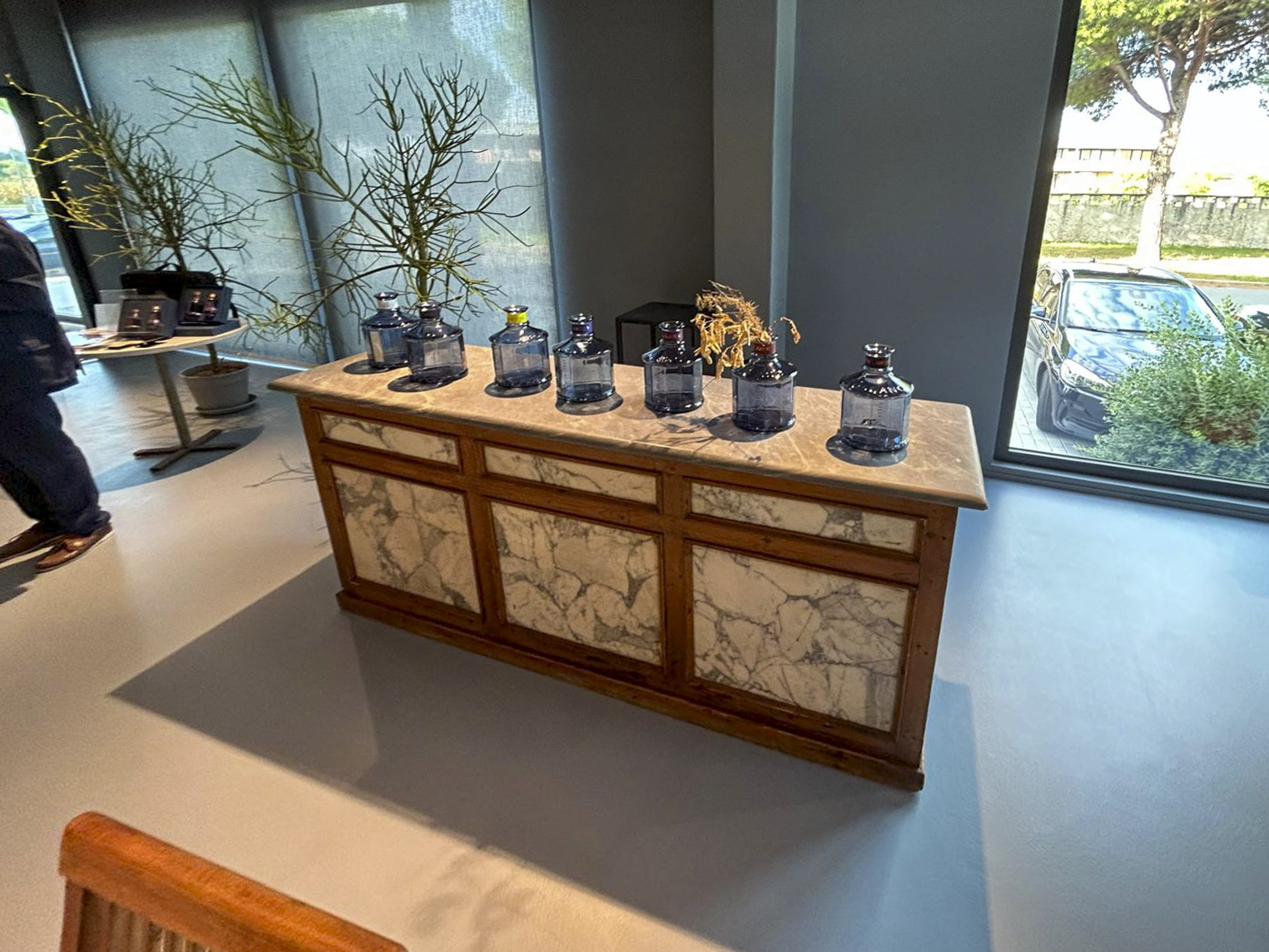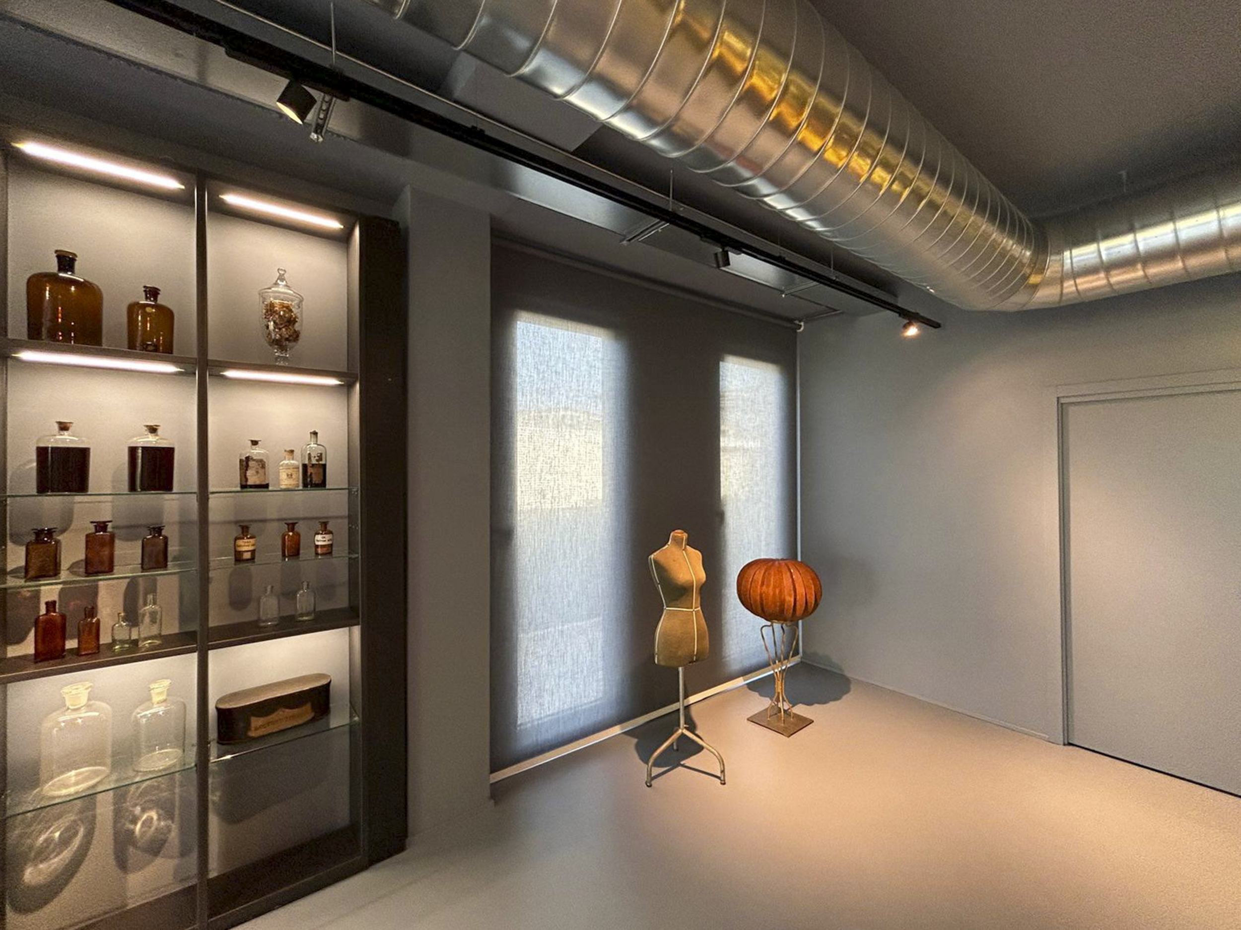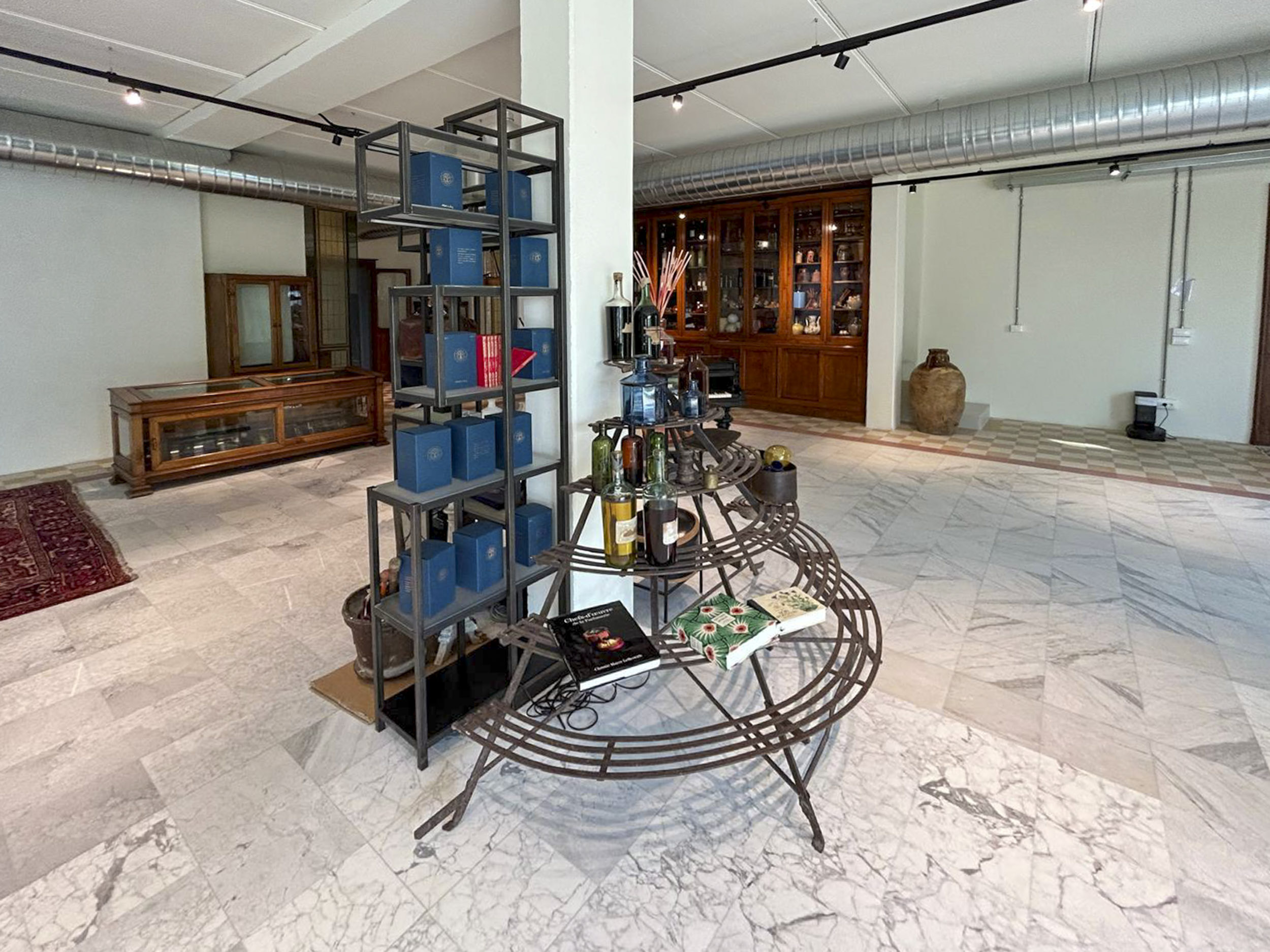 Gli elementi centrali dello showroom includono tavoli espositivi in metallo nero con piani vetro che presentano collezioni attraverso composizioni scenografiche: diffusori per ambienti con bastoncini naturali, flaconi decorativi in vetro soffiato con tappi sferici trasparenti, candele profumate, e bottiglie scultoree dalle forme organiche. Elementi decorativi stagionali come zucche ornamentali su supporti dorati introducono connessione con cicli naturali della tradizione erboristica.