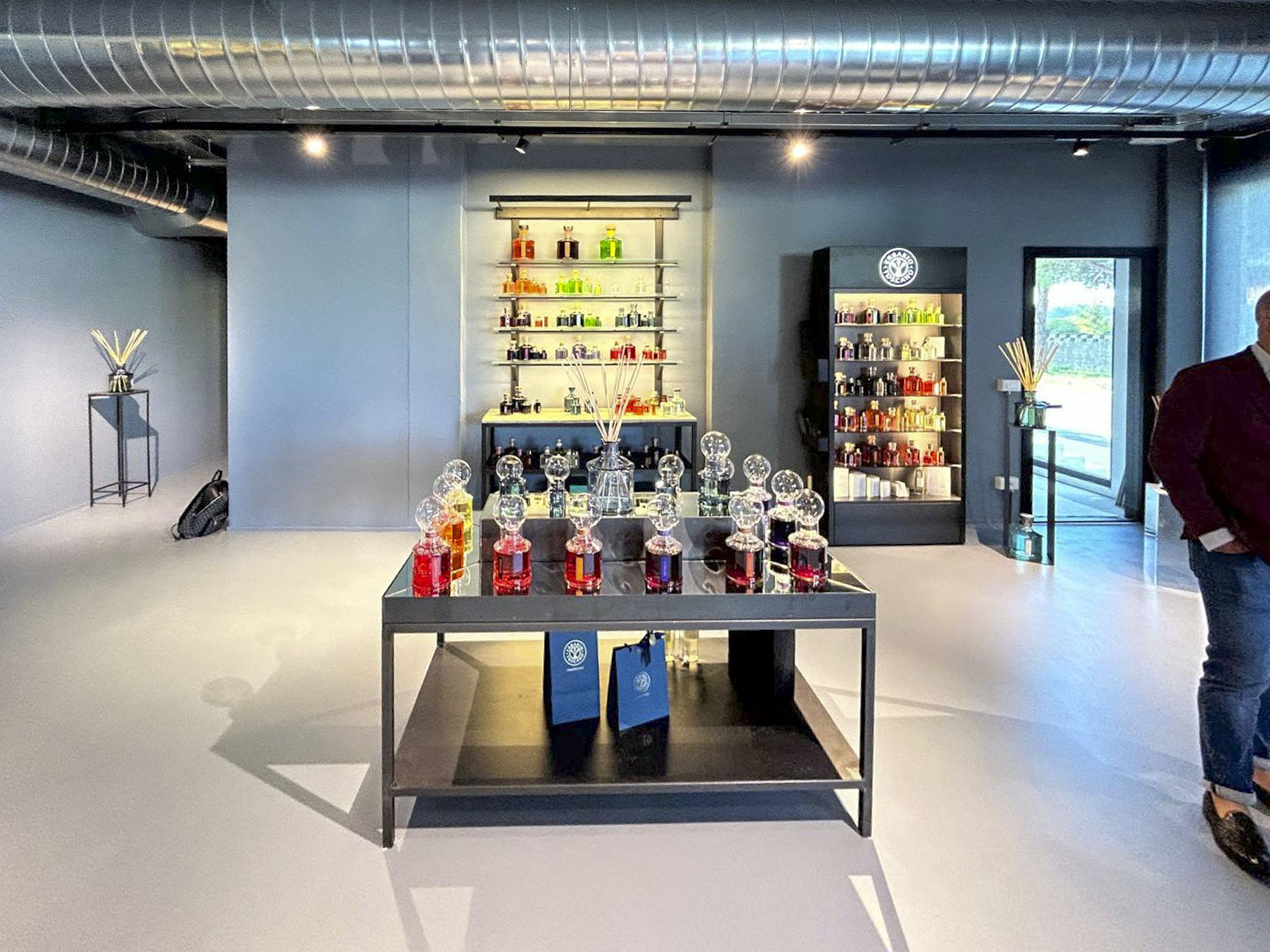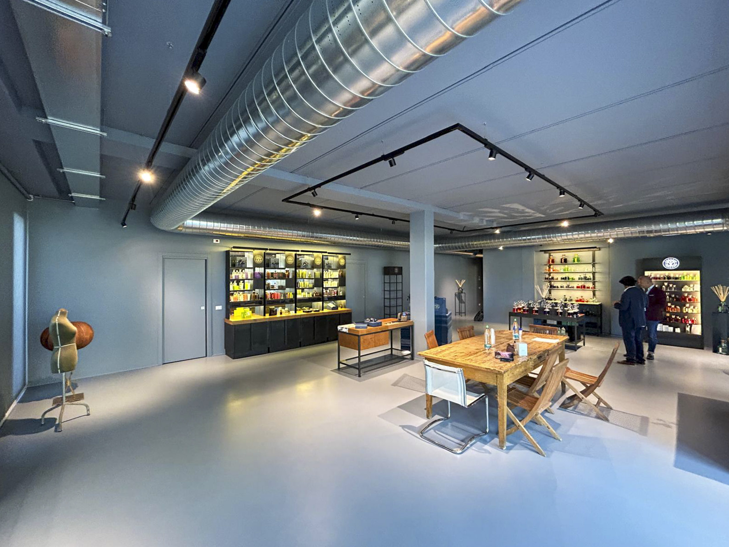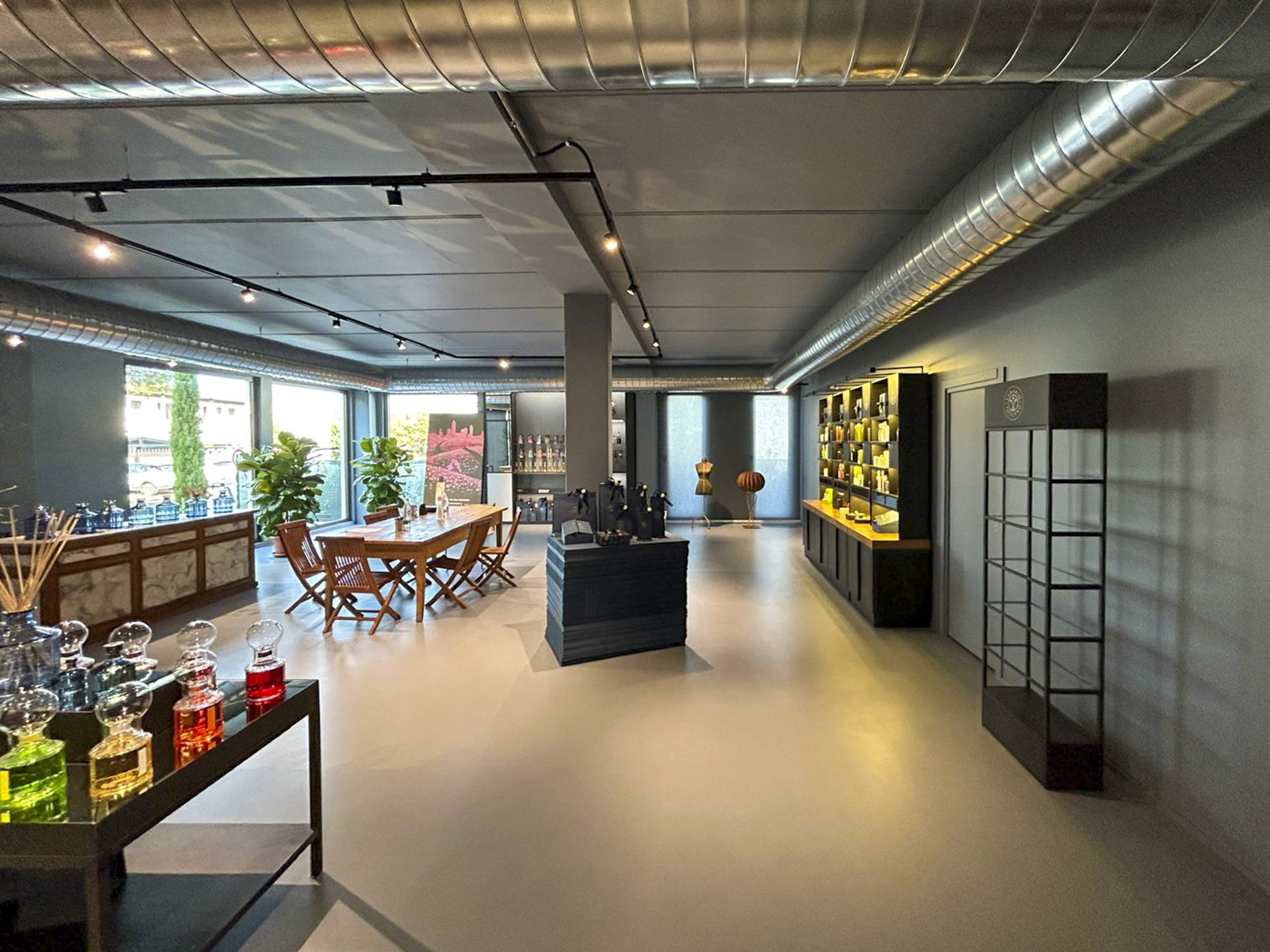 Lo showroom Erbario Toscano si configura come galleria espositiva caratterizzata da estetica industriale raffinata dove pareti grigio-blu profondo creano fondale sofisticato che esalta cromatismi vivaci dei prodotti esposti. I controsoffitti a vista rivelano canalizzazioni impiantistiche in alluminio lucido, mentre faretti orientabili su binari elettrificati neri permettono illuminazione flessibile direzionata strategicamente. Questa scelta estetica industrial-chic comunica autenticità produttiva e processo manifatturiero artigianale.I sistemi espositivi Erbario Toscano si articolano attraverso vetrine retroilluminate con strutture nere minimali che ospitano flaconi disposti secondo criteri cromatici creando composizioni sfumate, mensole sospese in vetro con illuminazione LED integrata, e scaffalature metalliche nere che ospitano l’intera gamma prodotti organizzata per linee. Il logo Erbario Toscano circolare con grafica botanica stilizzata corona le vetrine principali comunicando identità brand.