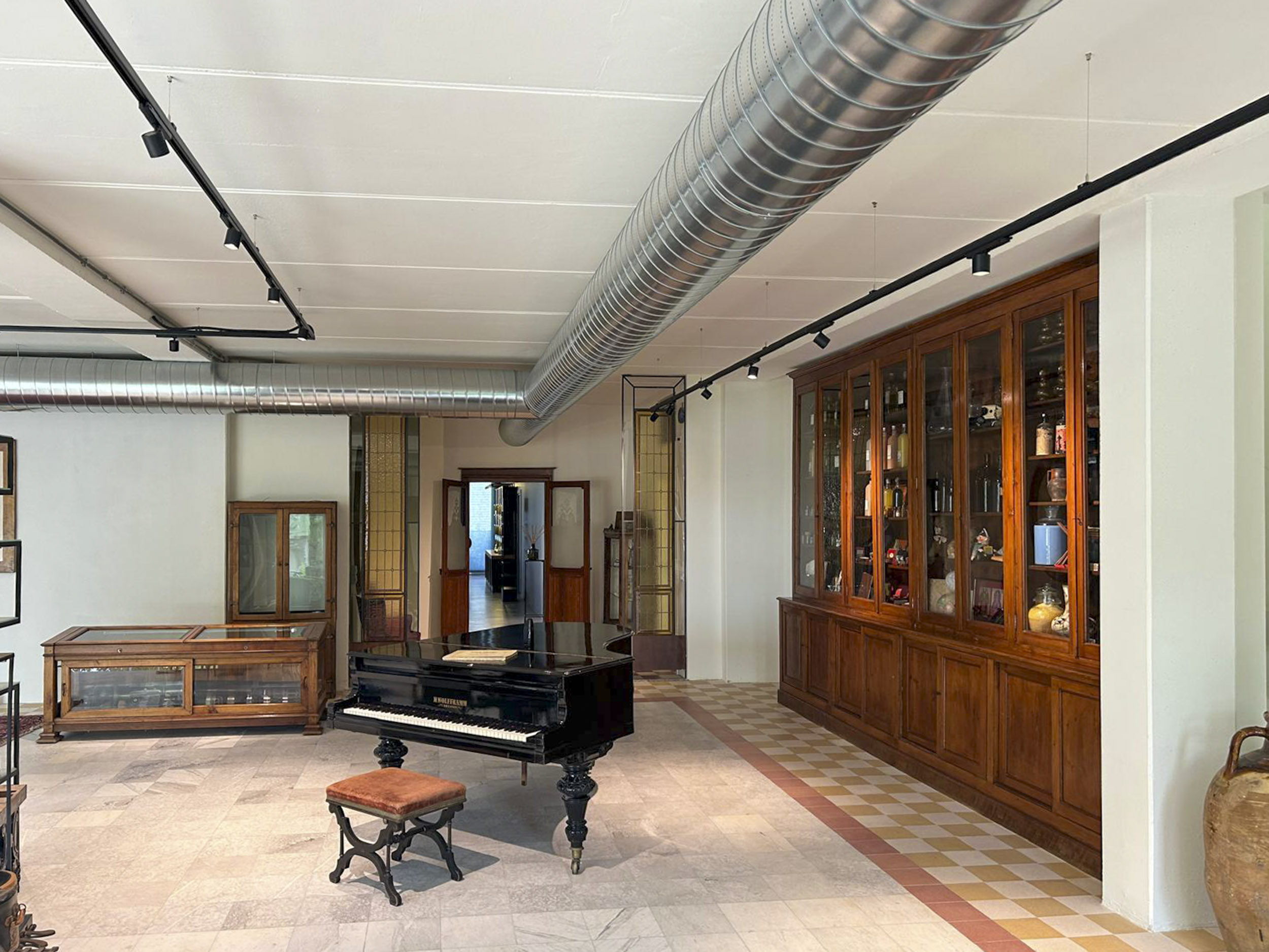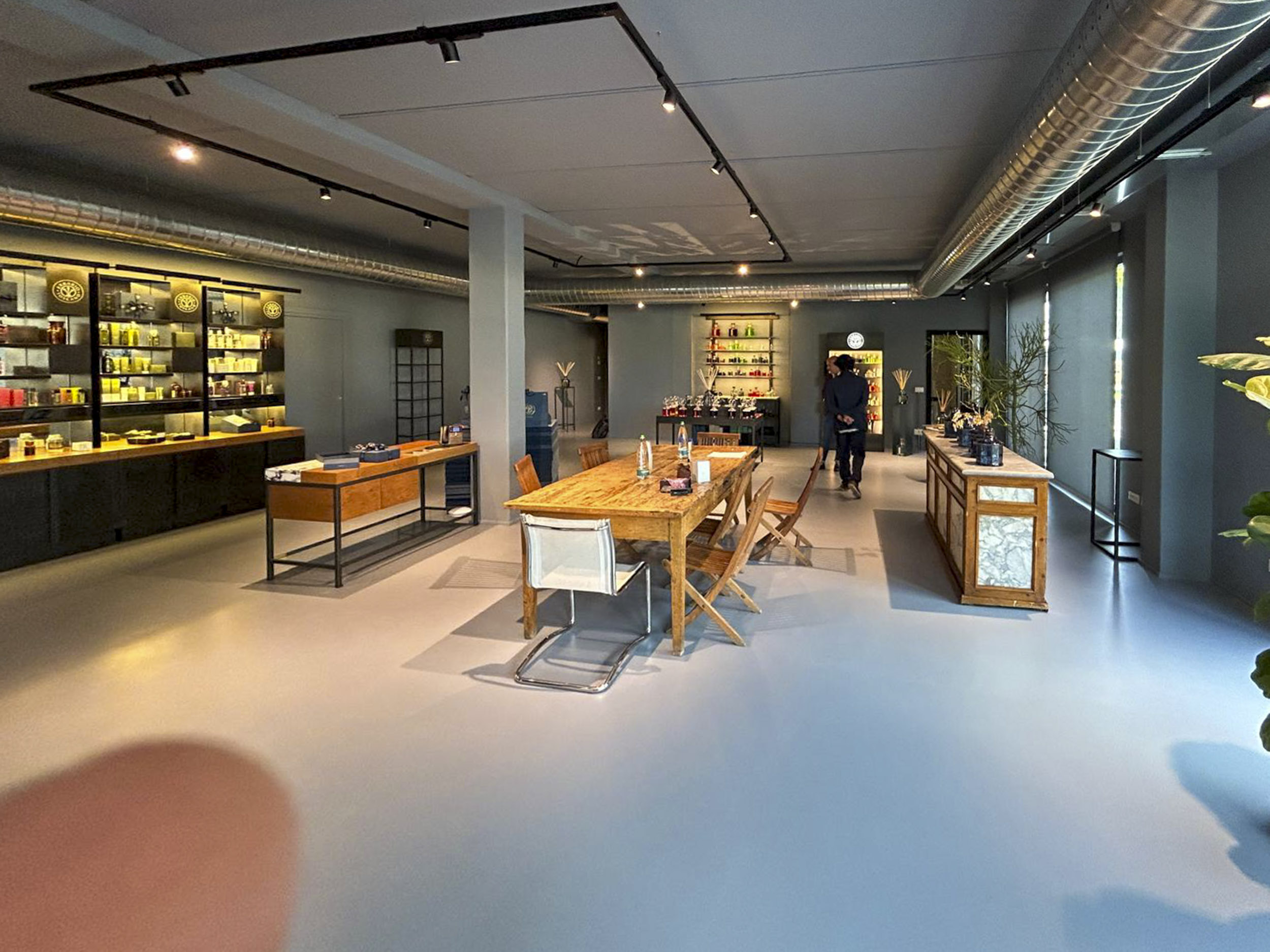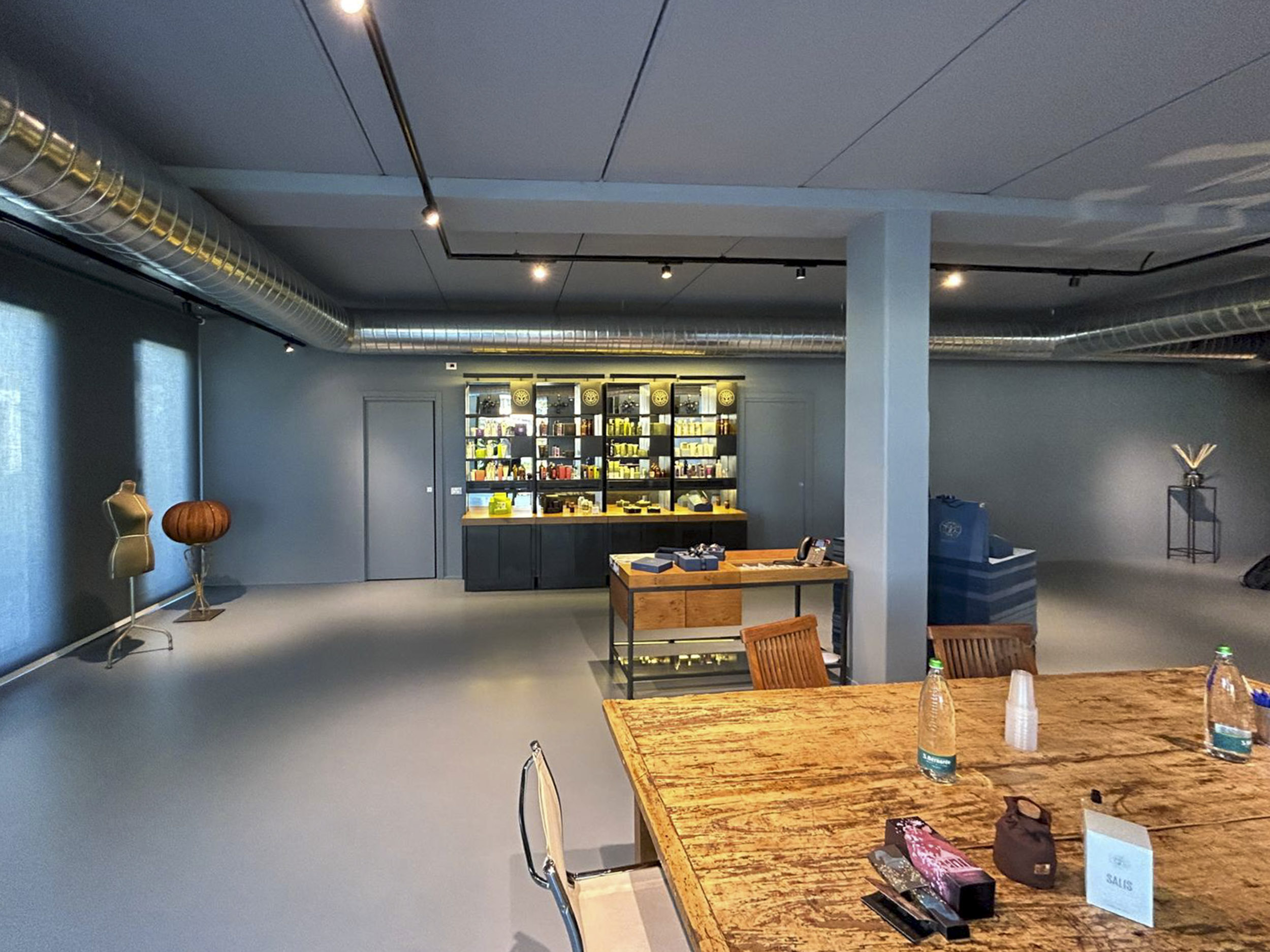 Lo showroom Erbario Toscano si configura come galleria espositiva caratterizzata da estetica industriale raffinata dove pareti grigio-blu profondo creano fondale sofisticato che esalta cromatismi vivaci dei prodotti esposti. I controsoffitti a vista rivelano canalizzazioni impiantistiche in alluminio lucido, mentre faretti orientabili su binari elettrificati neri permettono illuminazione flessibile direzionata strategicamente. Questa scelta estetica industrial-chic comunica autenticità produttiva e processo manifatturiero artigianale.I sistemi espositivi Erbario Toscano si articolano attraverso vetrine retroilluminate con strutture nere minimali che ospitano flaconi disposti secondo criteri cromatici creando composizioni sfumate, mensole sospese in vetro con illuminazione LED integrata, e scaffalature metalliche nere che ospitano l’intera gamma prodotti organizzata per linee. Il logo Erbario Toscano circolare con grafica botanica stilizzata corona le vetrine principali comunicando identità brand.