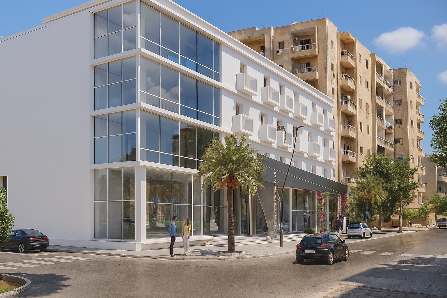 L’edificio si presenta all’esterno con un’architettura contemporanea pulita caratterizzata da facciate bianche scandite da ampie vetrate continue e aperture regolari che creano ritmo compositivo. Il volume principale si sviluppa su quattro livelli con un basamento commerciale vetrato che si affaccia sulla strada urbana, mentre i piani superiori presentano una facciata con pattern decorativo geometrico tridimensionale che introduce texture e profondità visiva, alternando superfici piene a finestre quadrate incassate che creano giochi di luce e ombra. L’angolo dell’edificio è marcato da una torre vetrata che enfatizza la presenza architettonica nel contesto urbano, inserendosi in un tessuto edilizio denso caratterizzato da edifici residenziali più datati in tonalità beige che creano contrasto con la modernità del nuovo intervento.