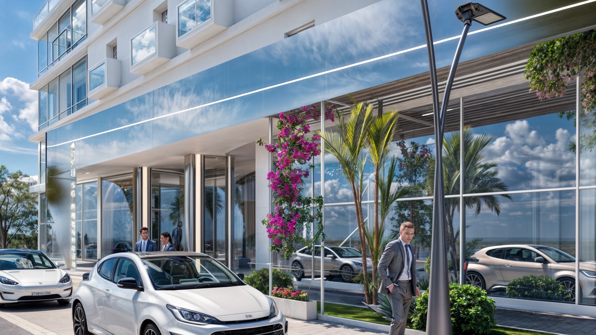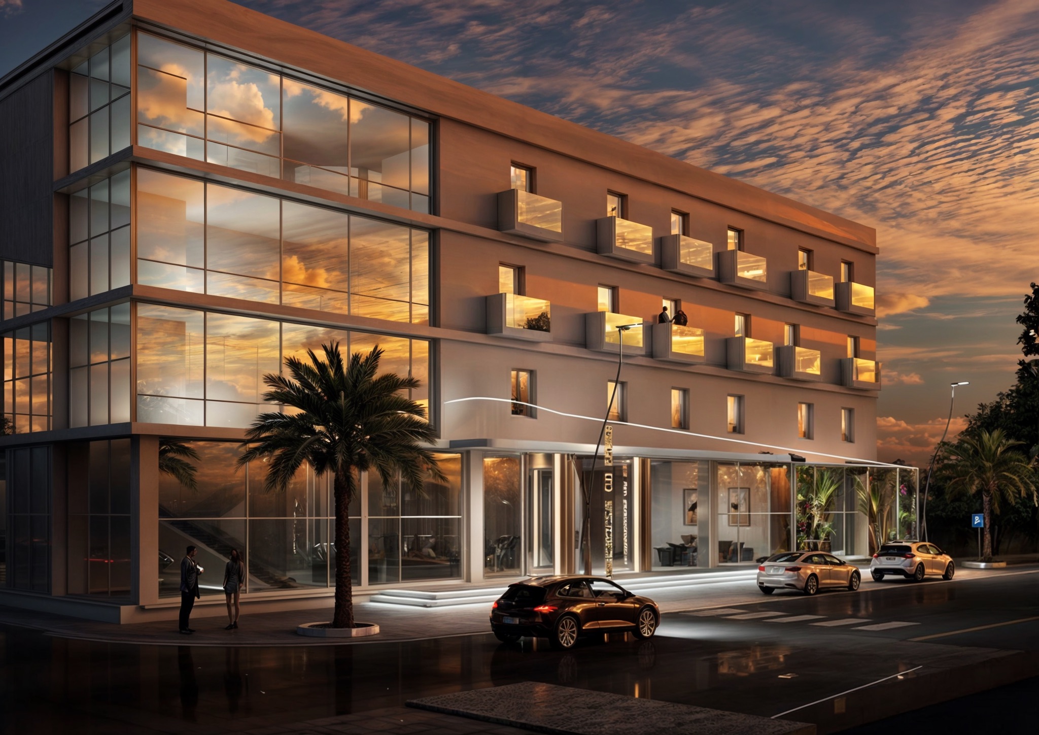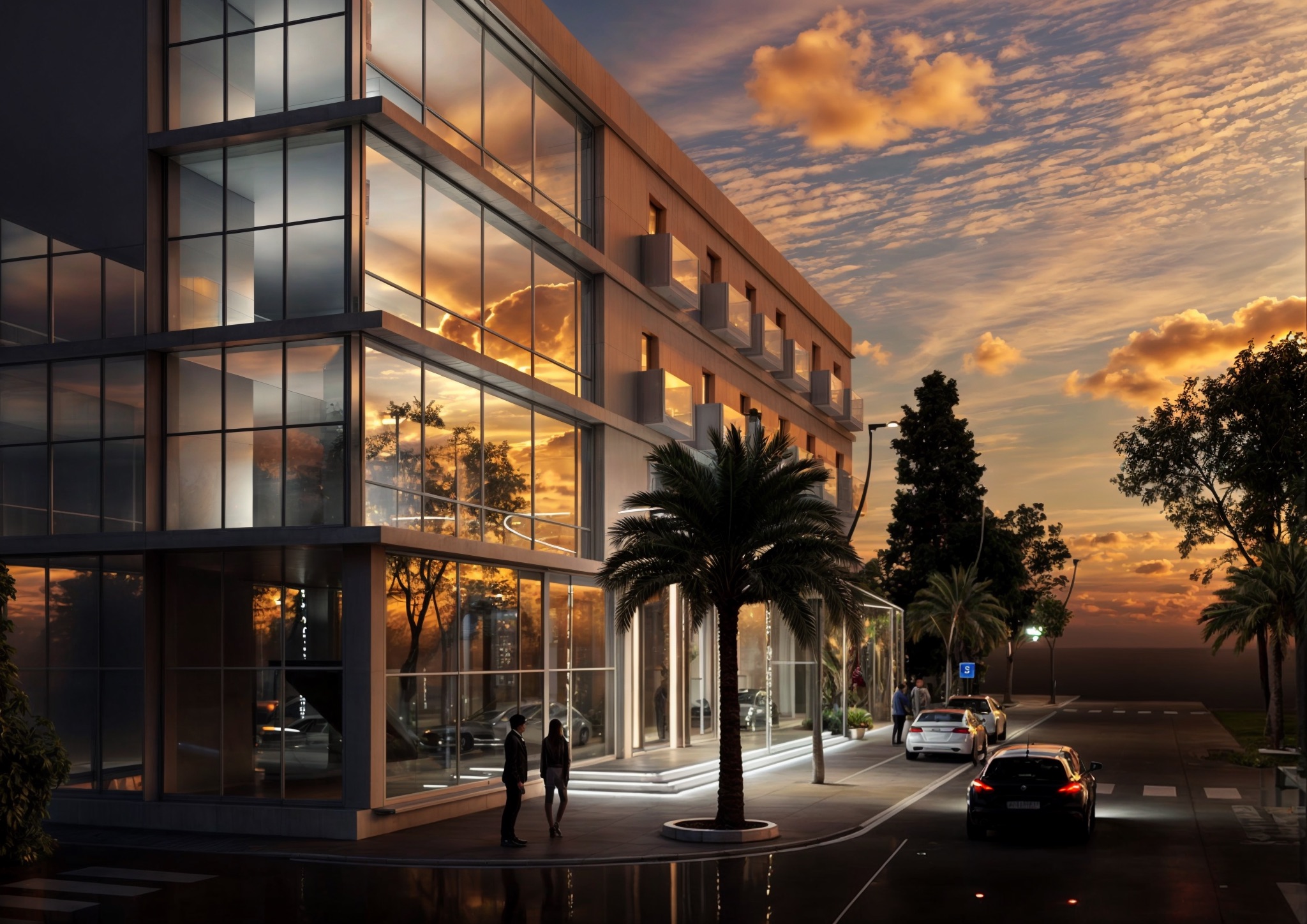 L’accesso principale è definito da un portico coperto con pensilina curva che protegge l’ingresso vetrato, mentre palme ornamentali e vegetazione mediterranea colorata introducono elementi naturali che ammorbidiscono l’architettura e creano accoglienza. L’illuminazione notturna trasforma l’edificio in lanterna urbana dove le vetrate illuminate dall’interno rivelano gli spazi interni creando trasparenza e apertura, mentre la facciata assume tonalità calde dorate che dialogano con i cieli al tramonto tipici del clima mediterraneo.