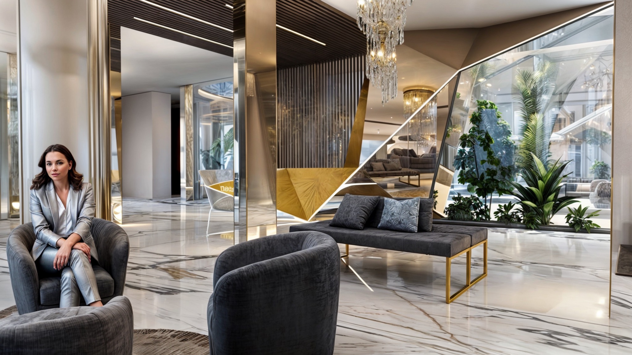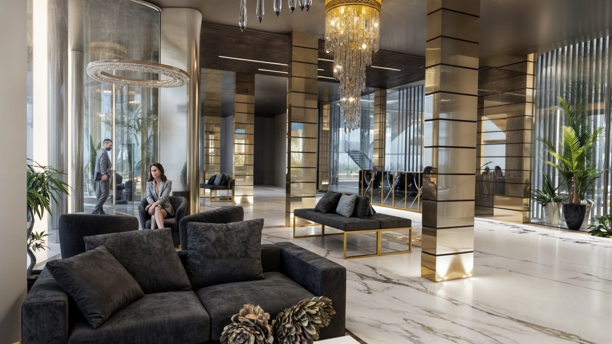 Gli arredi della lobby presentano sedute contemporanee di design in velluto grigio antracite con strutture metalliche dorate che creano contrasti sofisticati, disposte in composizioni conversazionali attorno a tavolini bassi dalle forme organiche con piani in marmo e basi scultoree metalliche. Lampadari chandelier monumentali in cristallo con strutture dorate pendono dai controsoffitti a doppia altezza creando punti focali luminosi e introducendo eleganza classica reinterpretata in chiave contemporanea, mentre lampade a sospensione cilindriche dorate di grandi dimensioni segnano zone funzionali specifiche come la reception e le aree lounge.