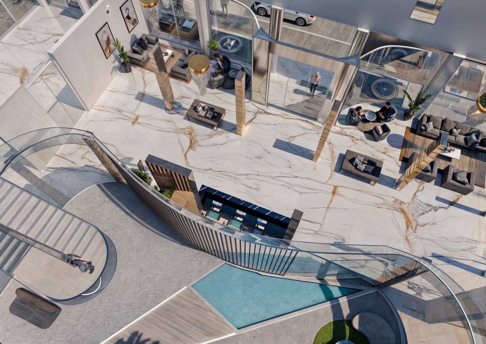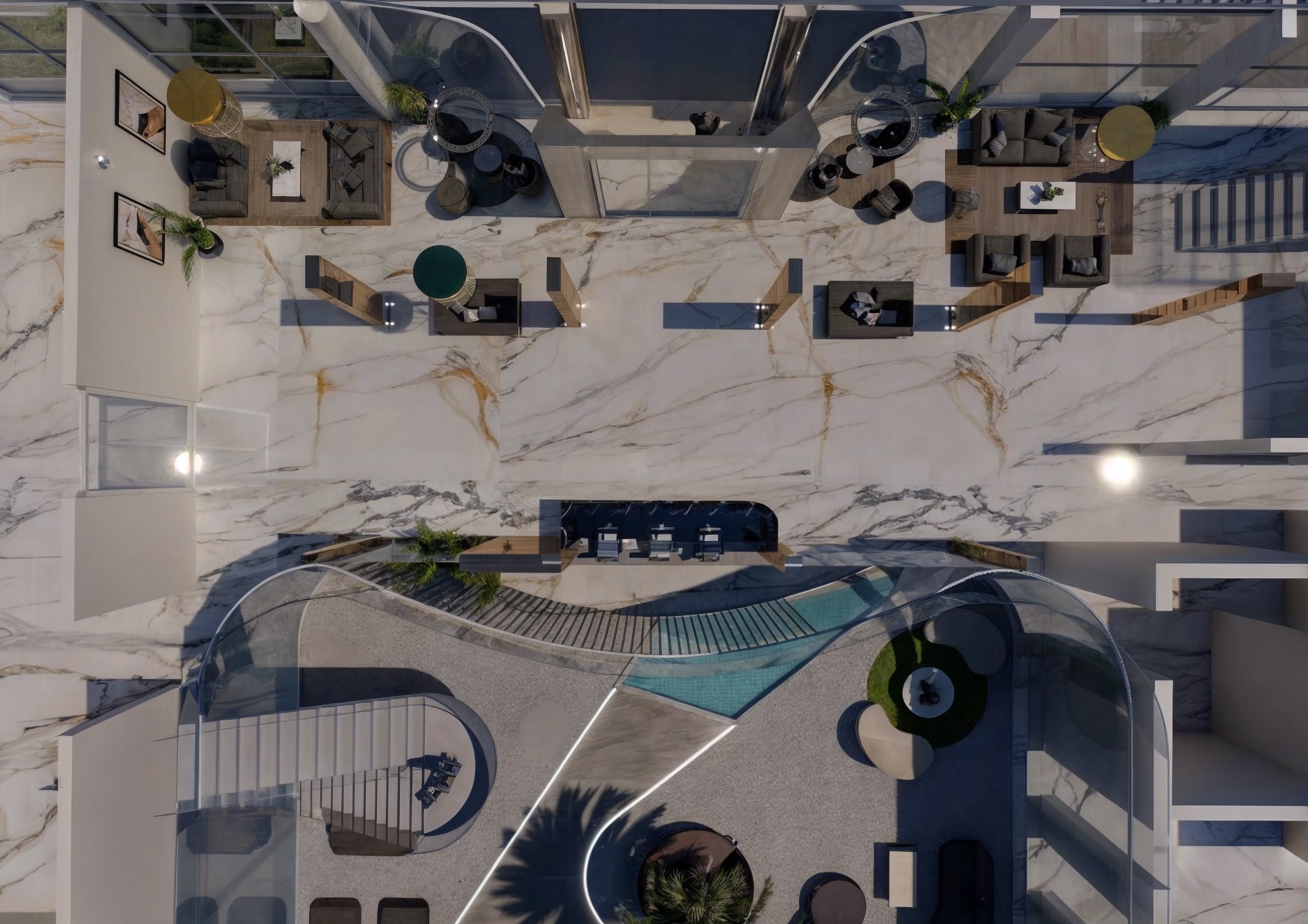 Gli spazi esterni attrezzati rappresentano un elemento distintivo del progetto con terrazze e aree lounge che si affacciano sulla strada urbana attraverso vetrate continue dal pavimento al soffitto. Una piscina geometrica turchese incastonata nel pavimento marmoreo crea un elemento scenografico inaspettato che introduce acqua e riflessi luminosi, circondata da sedute e lettini contemporanei in tonalità blu navy coordinate. Pensiline metalliche curve con doghe orizzontali creano zone d’ombra e definiscono architettonicamente gli spazi esterni, mentre elementi cilindrici dorati fungono da elementi scultorei verticali che marcano percorsi e creano ritmo compositivo.