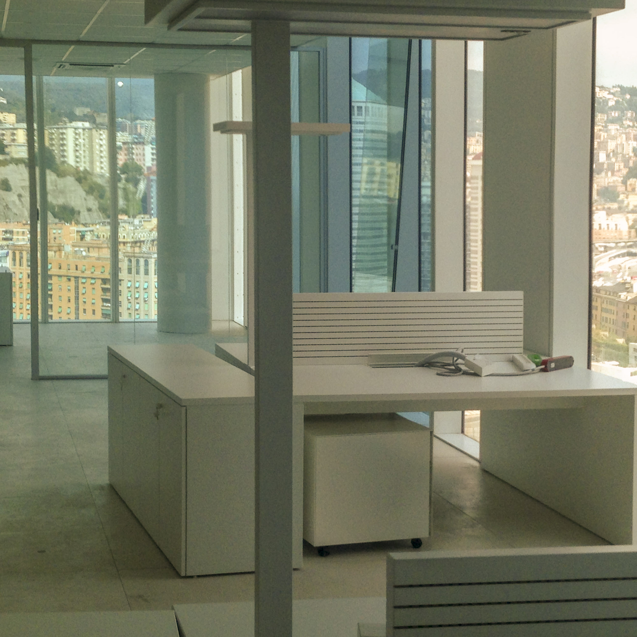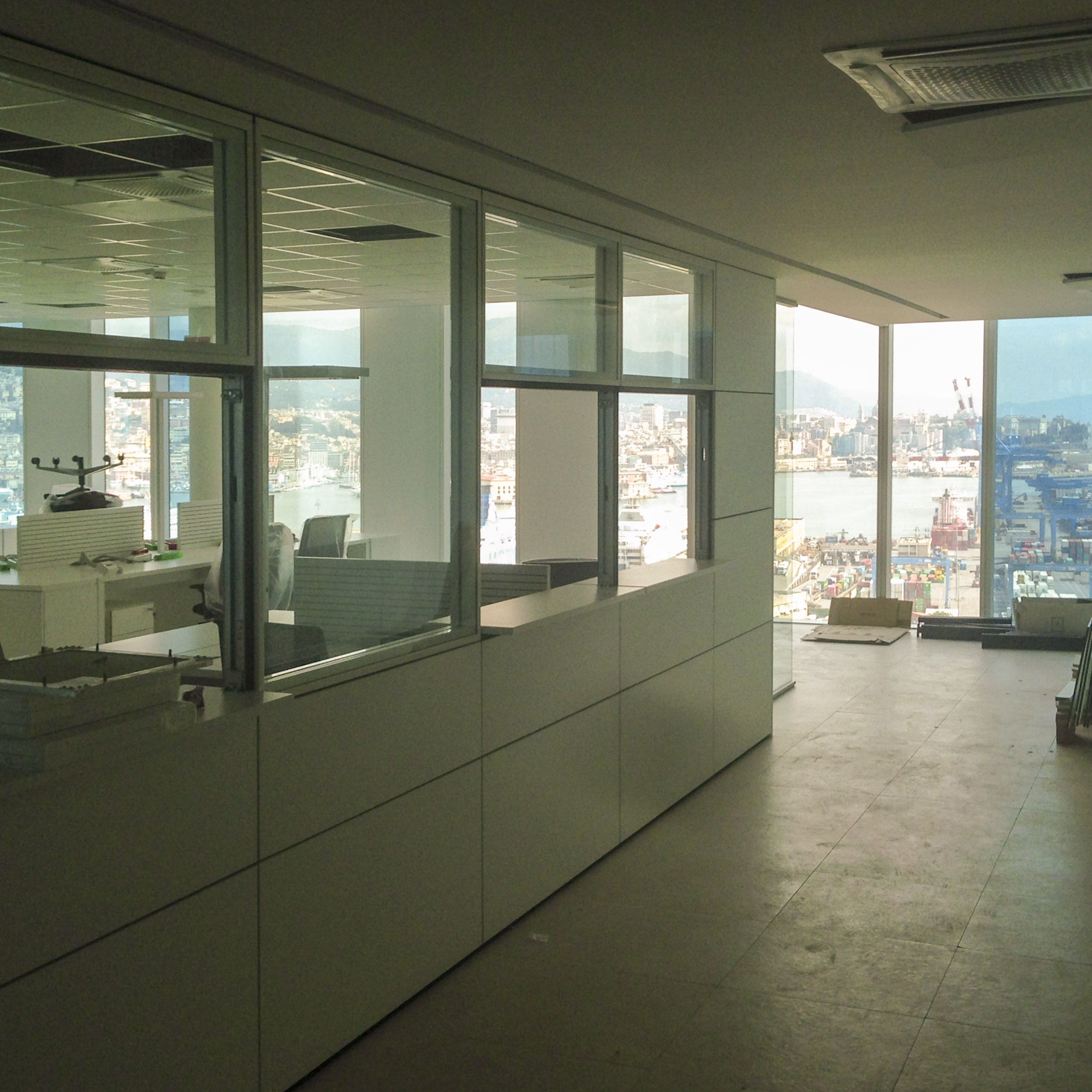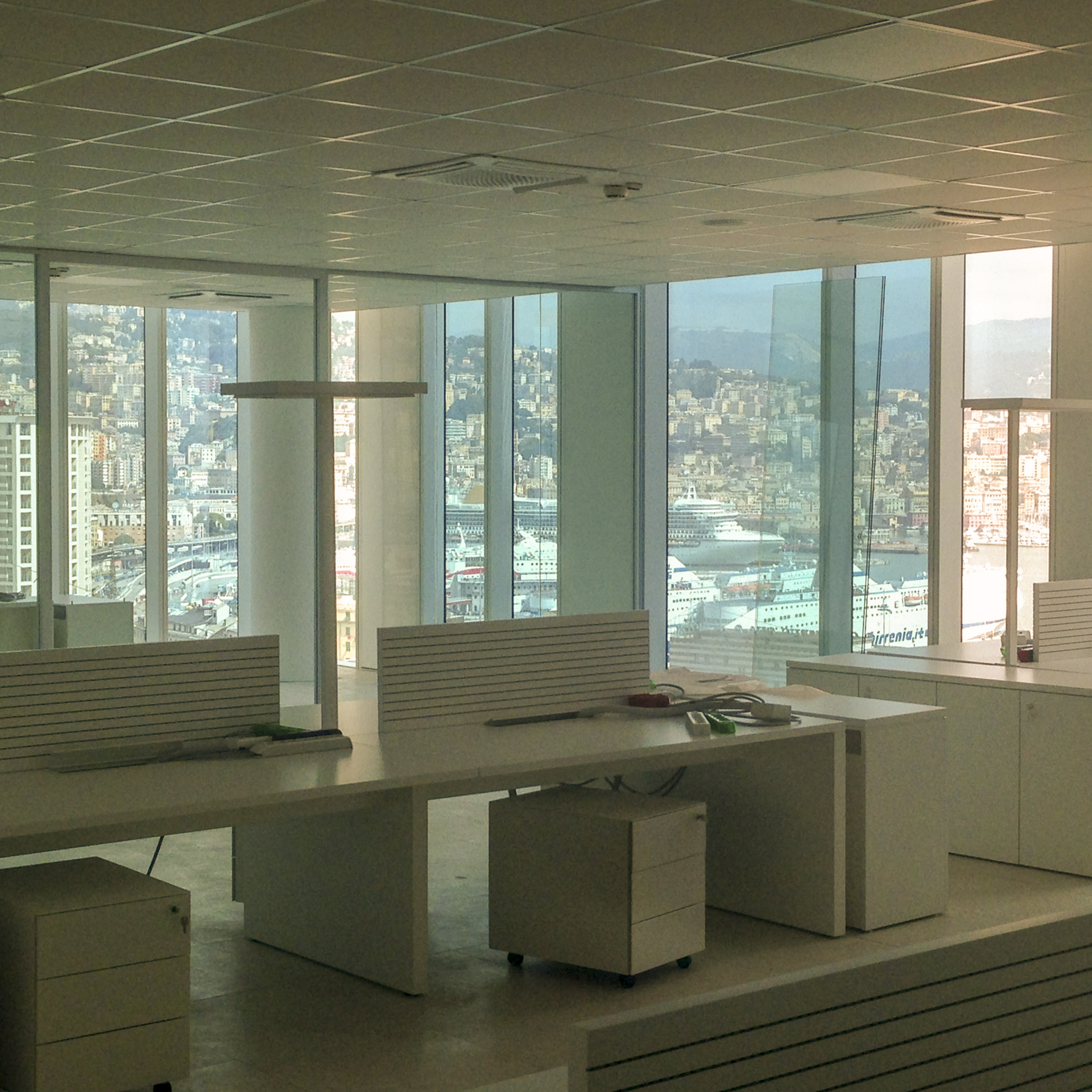 Gli spazi si sviluppano secondo un layout aperto dove vetrate perimetrali continue dal pavimento al soffitto creano un rapporto diretto e costante con il paesaggio urbano e marittimo circostante. Le viste spaziano dalle aree portuali con navi da crociera MSC ormeggiate ai moli, al tessuto urbano denso della città, fino alle montagne sullo sfondo e al mare aperto, trasformando ogni postazione di lavoro in un belvedere privilegiato. Questa condizione di verticalità e apertura visiva definisce il carattere distintivo del progetto.