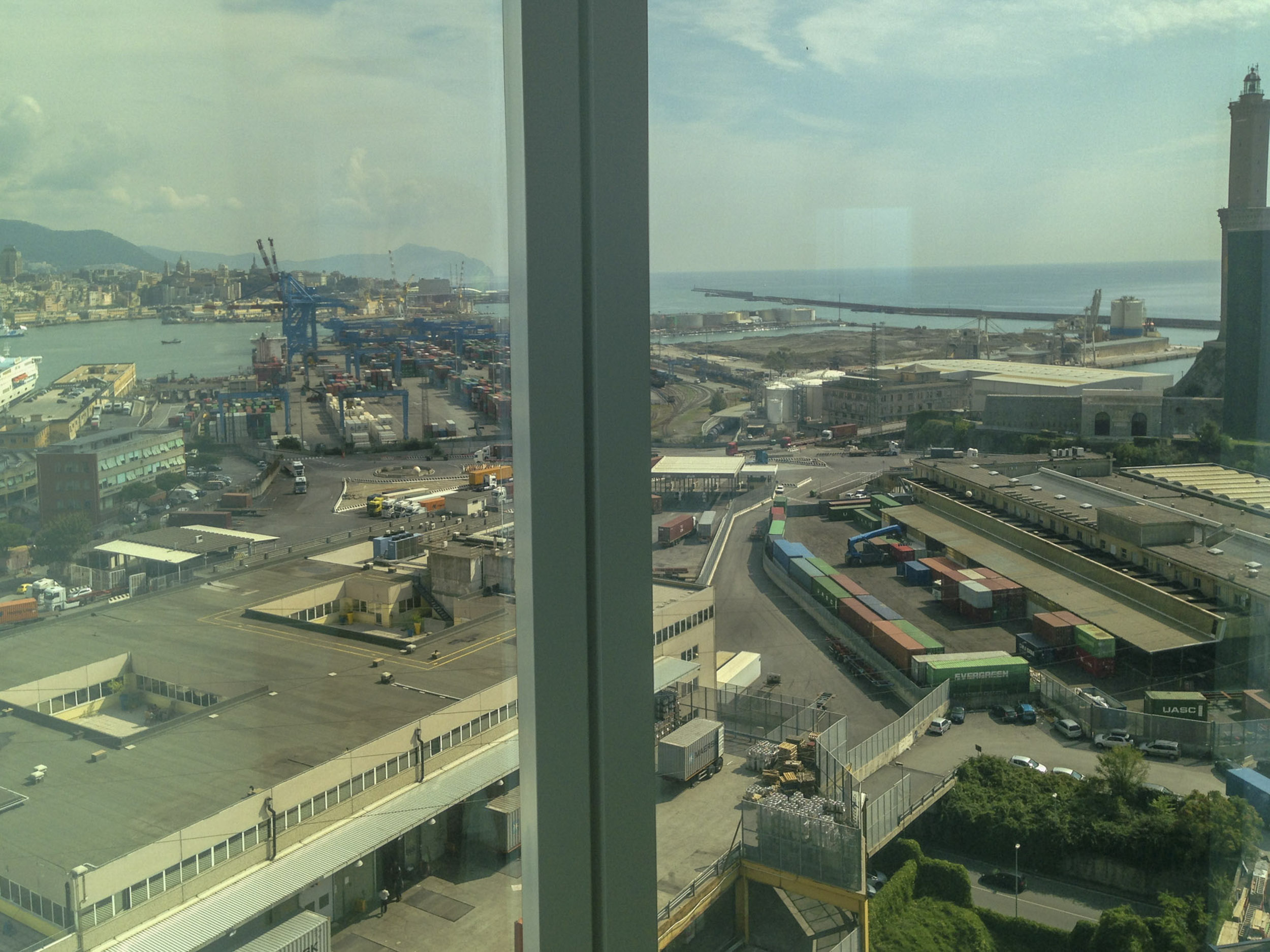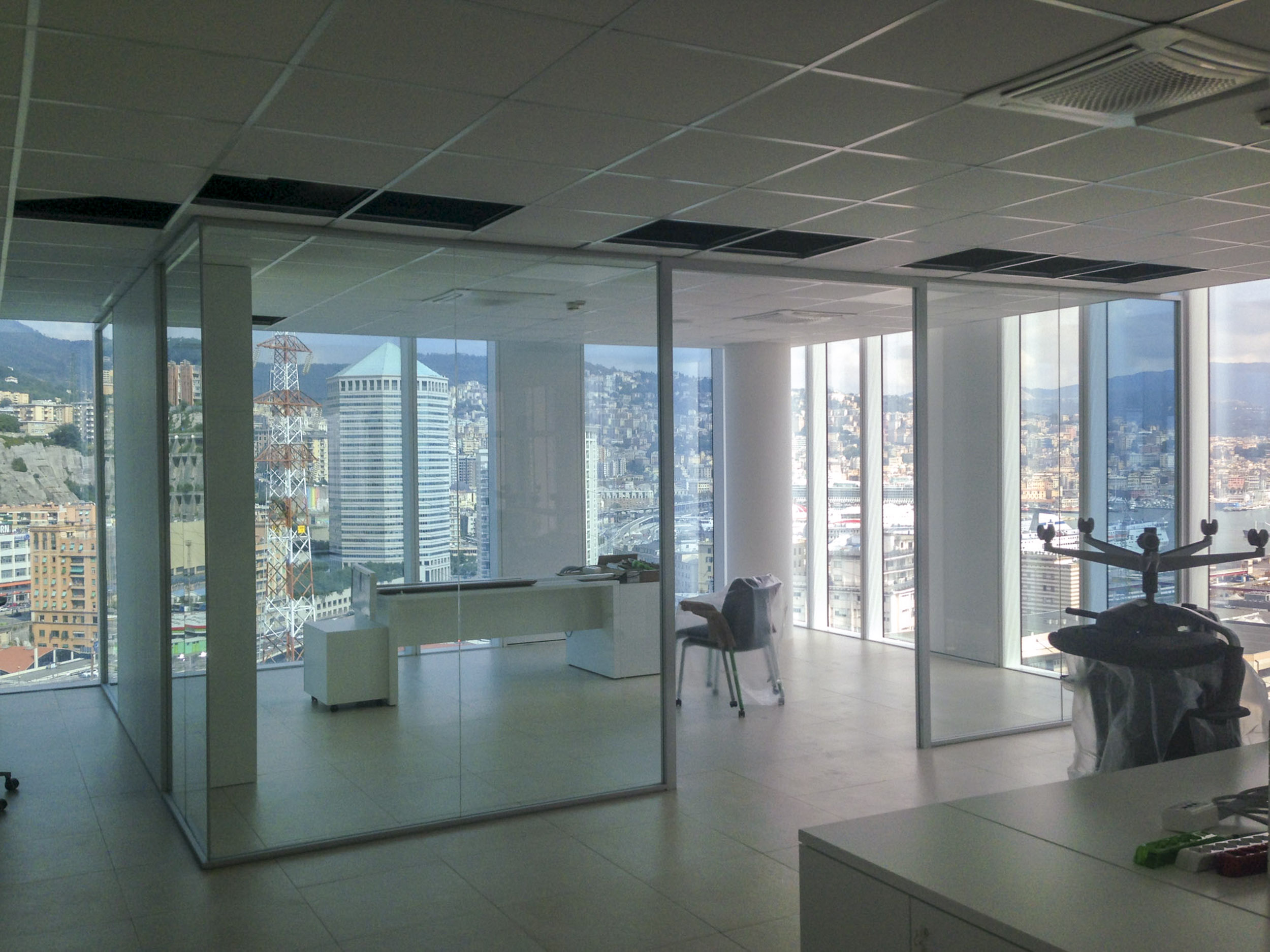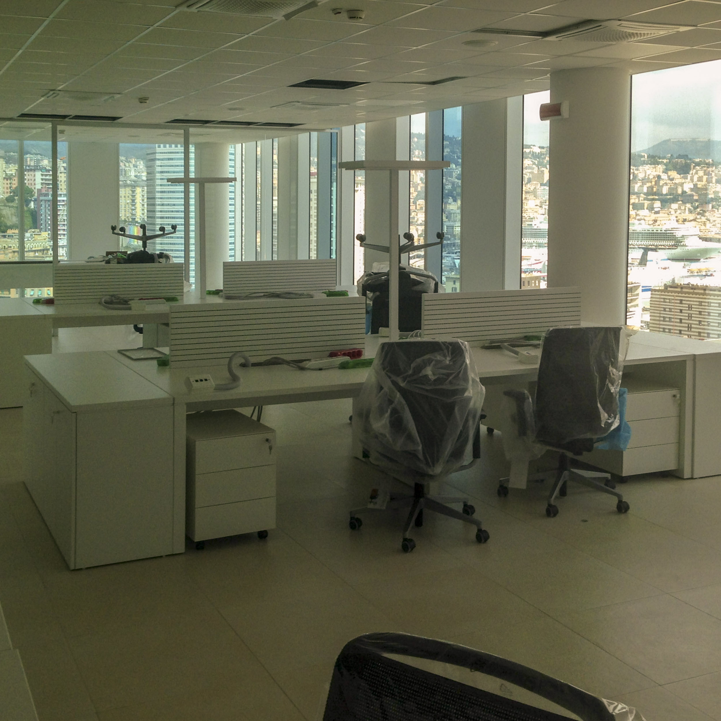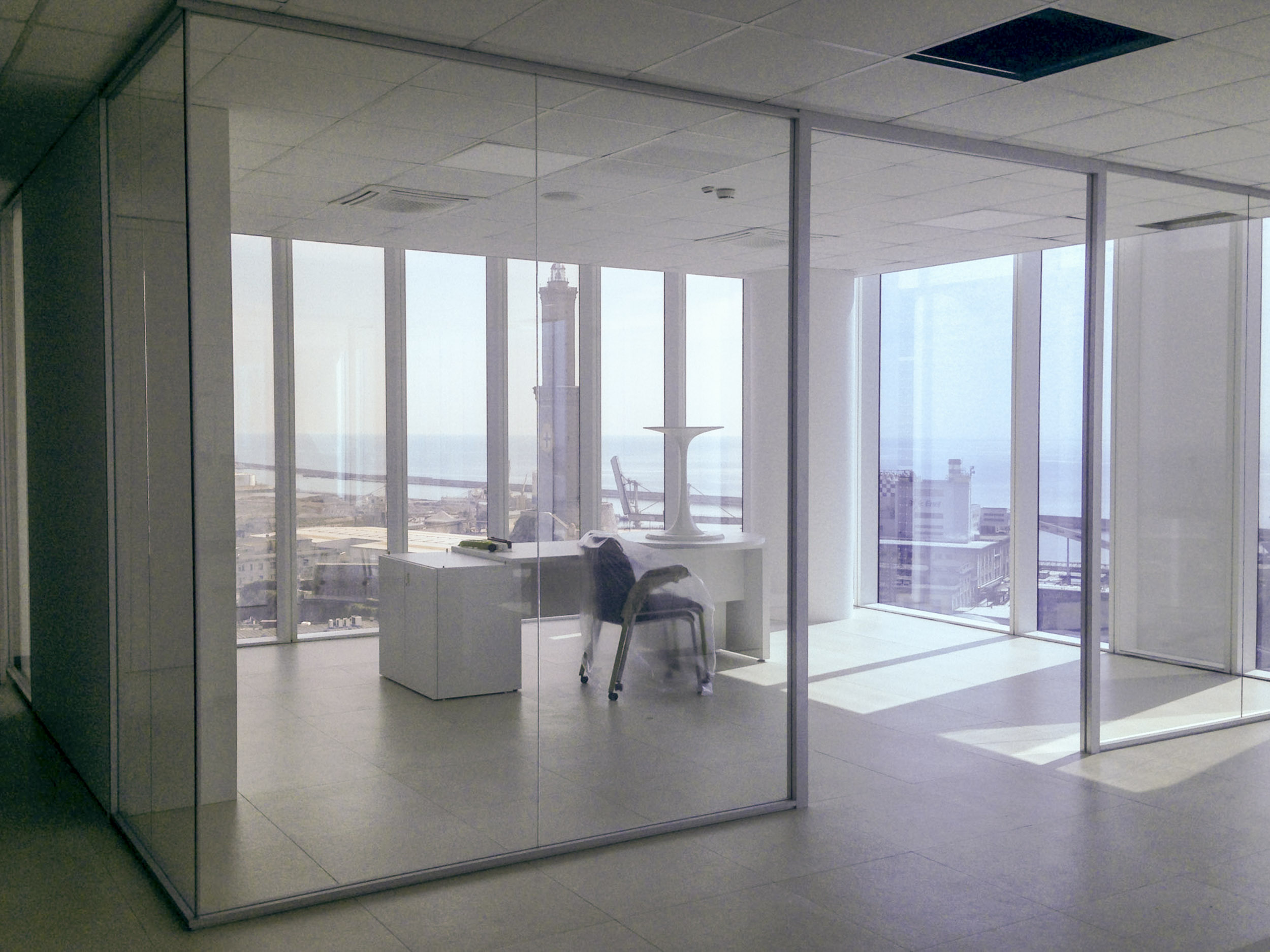 Gli spazi si sviluppano secondo un layout aperto dove vetrate perimetrali continue dal pavimento al soffitto creano un rapporto diretto e costante con il paesaggio urbano e marittimo circostante. Le viste spaziano dalle aree portuali con navi da crociera MSC ormeggiate ai moli, al tessuto urbano denso della città, fino alle montagne sullo sfondo e al mare aperto, trasformando ogni postazione di lavoro in un belvedere privilegiato. Questa condizione di verticalità e apertura visiva definisce il carattere distintivo del progetto.