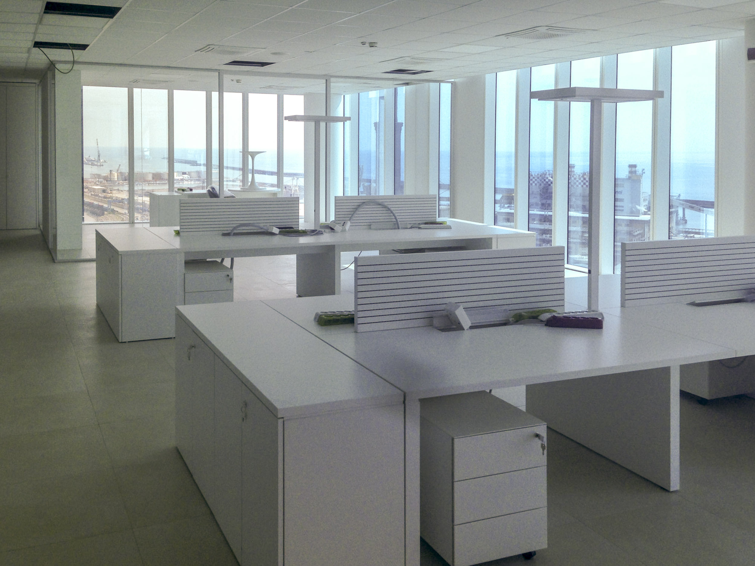 Gli arredi si mantengono rigorosamente bianchi e minimal, privilegiando forme essenziali contemporanee che non competono visivamente con le viste esterne. Le scrivanie operative presentano configurazioni lineari o ad L, i sistemi di storage sono integrati in volumi bassi che non ostruiscono le visuali, e le sedute operative mesh nere introducono l’unico contrasto cromatico necessario per definizione funzionale senza eccessi decorativi.